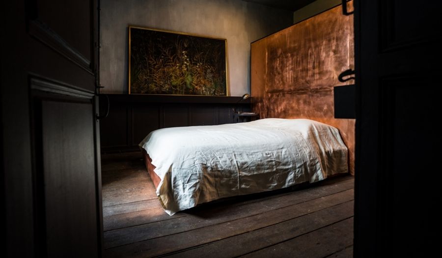 La chambre avec son îlot-lit atypique en cuivre rappelle les aventures à la Jules Verne.