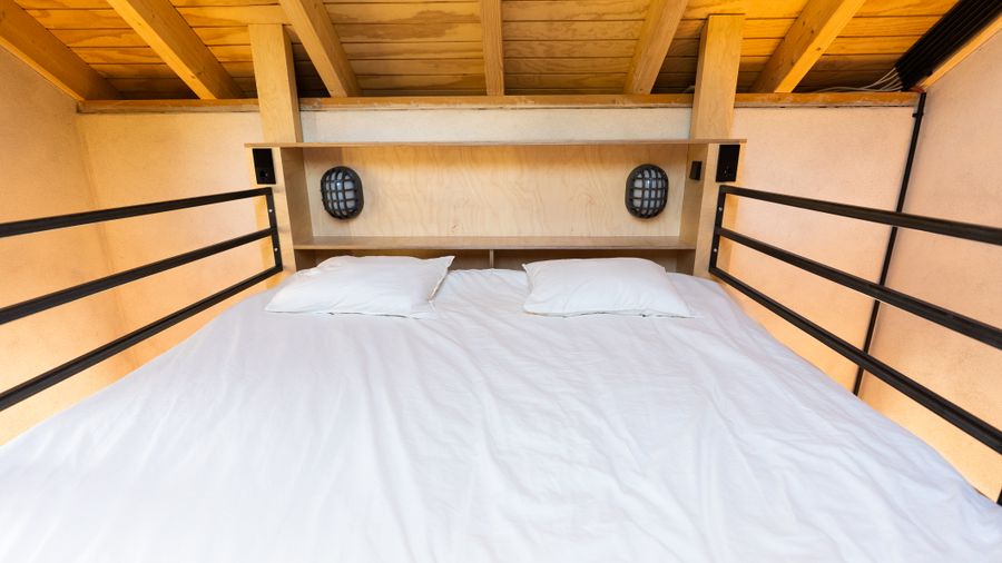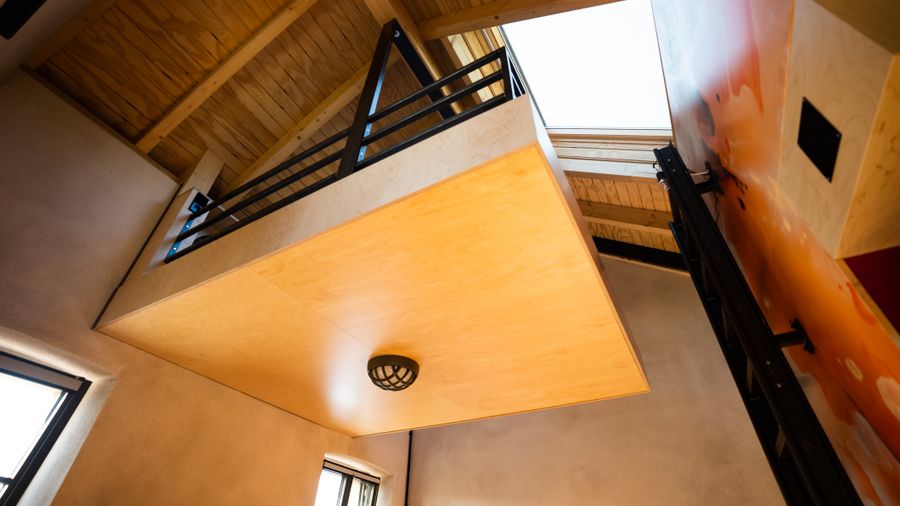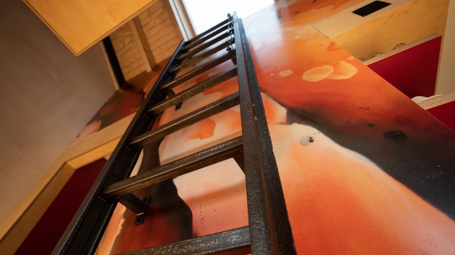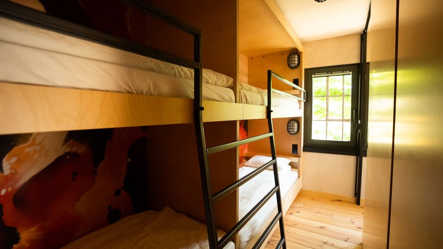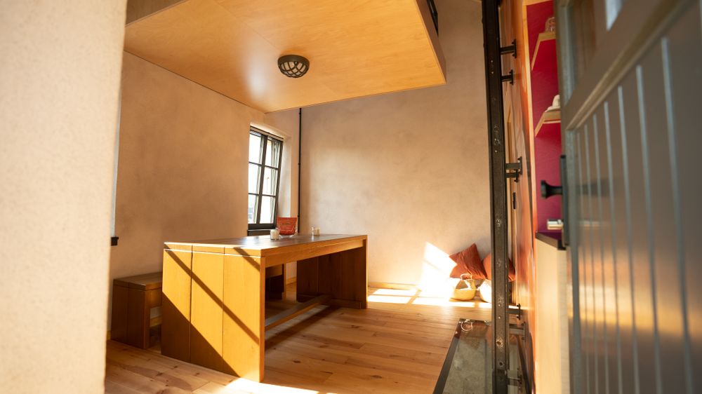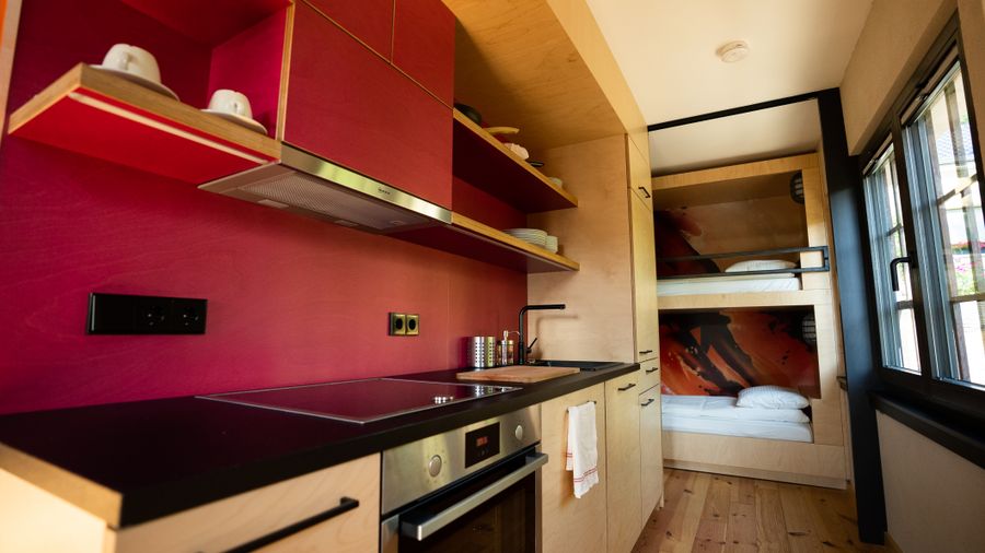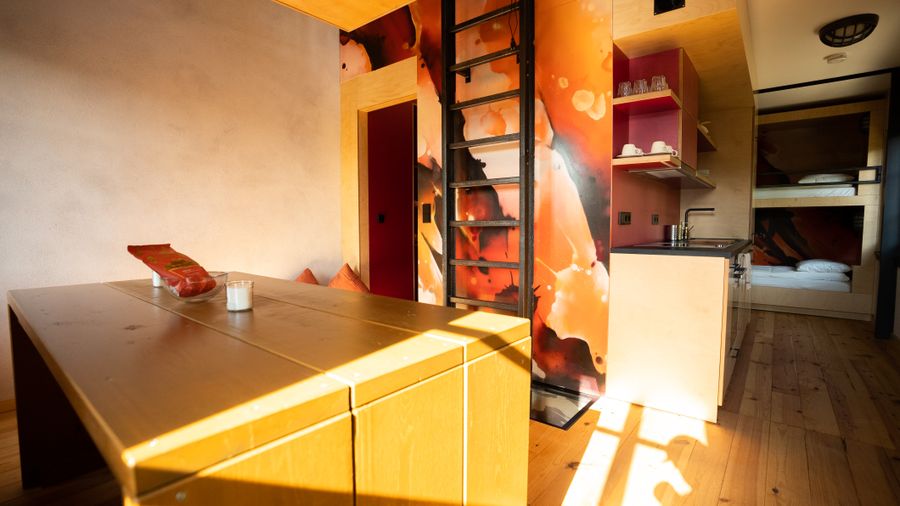 Les travaux de transformation de cet ancien bâtiment administratif avaient pour vision très claire de préserver et de respecter la forme de base historique existante du bâtiment. La façade extérieure reste la même, et l'intérieur devrait également continuer à illustrer le lien étroit avec le passé industriel. Entre « Street Art » et fresques, cette « Kabaischen » se joue de la culture industrielle. Le premier étage avec les couchages est accessible par une échelle, les couchages sont divisés en trois pièces séparées. Le bureau responsable était Tetra Kayser Associés.