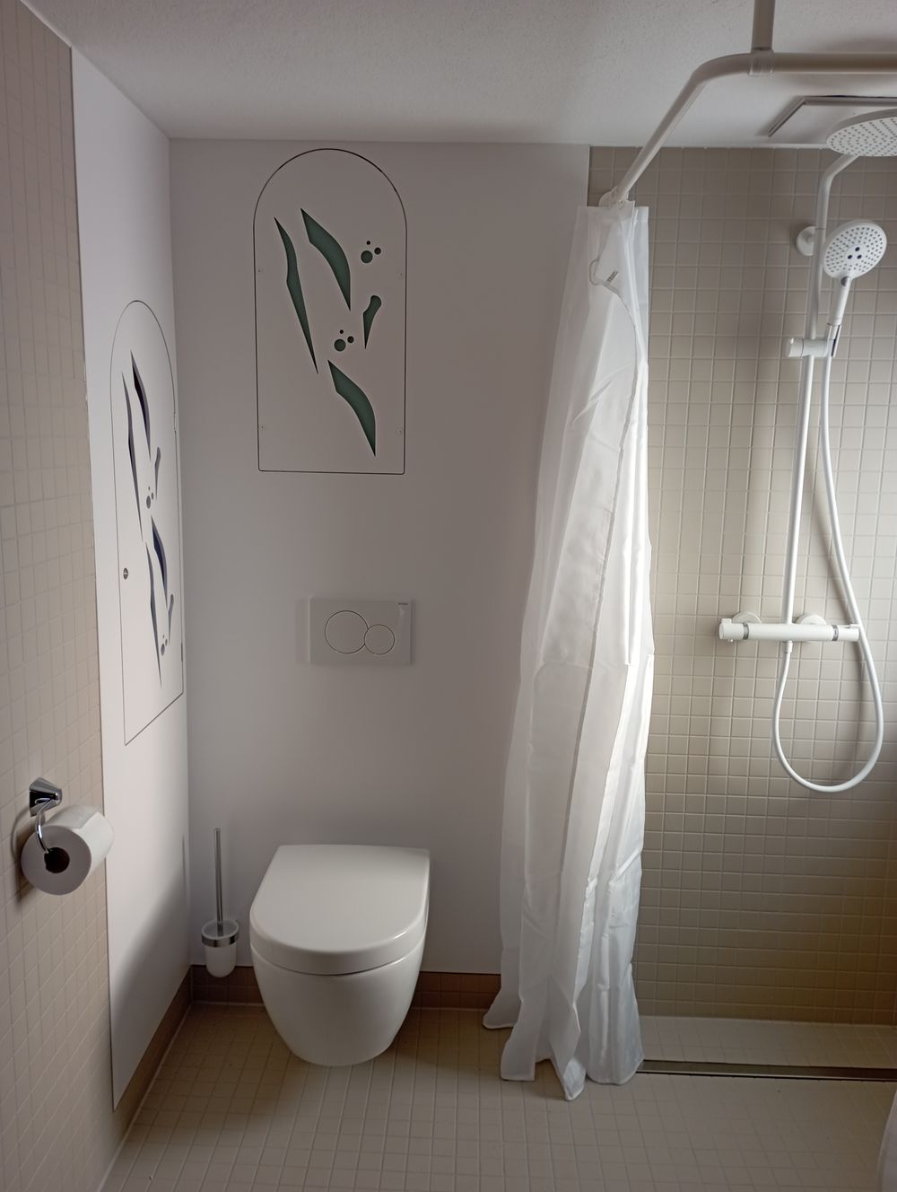 L'entrée est agrémentée d'une sculpture conçue comme une porte et d'une passerelle en roche enrichie de minerai de fer, montrant la proximité avec le passé de traitement du minerai de la région. L'ensemble de l'espace extérieur en bois a été réalisé avec un artiste et est destiné à refléter l'intérieur du gîte - également principalement en bois.