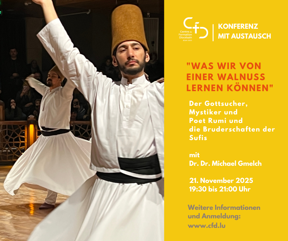 Le mystique soufi Rumi, connu dans le monde entier, est l'un des plus grands poètes persans. En 2023, ses disciples ont célébré le 750e anniversaire de sa mort dans le monde entier. Il est surtout connu pour ses poèmes d'amour sensuels et érotiques et pour les derviches tourneurs. De nos jours, de nombreux chercheurs spirituels trouvent chez lui des réponses qui les encouragent et les guident. Michael Gmelch a rendu visite à des confréries soufies dans différents pays. Il se demande : quelle contribution peuvent-elles apporter aux personnes intéressées par la spiritualité qui ne cherchent plus (uniquement) l'expérience de Dieu dans les églises ? Il lit des extraits de son dernier livre : « Wirbeltanz im Wartesaal der Ewigkeit » (Danse tourbillonnante dans la salle d'attente de l'éternité).
