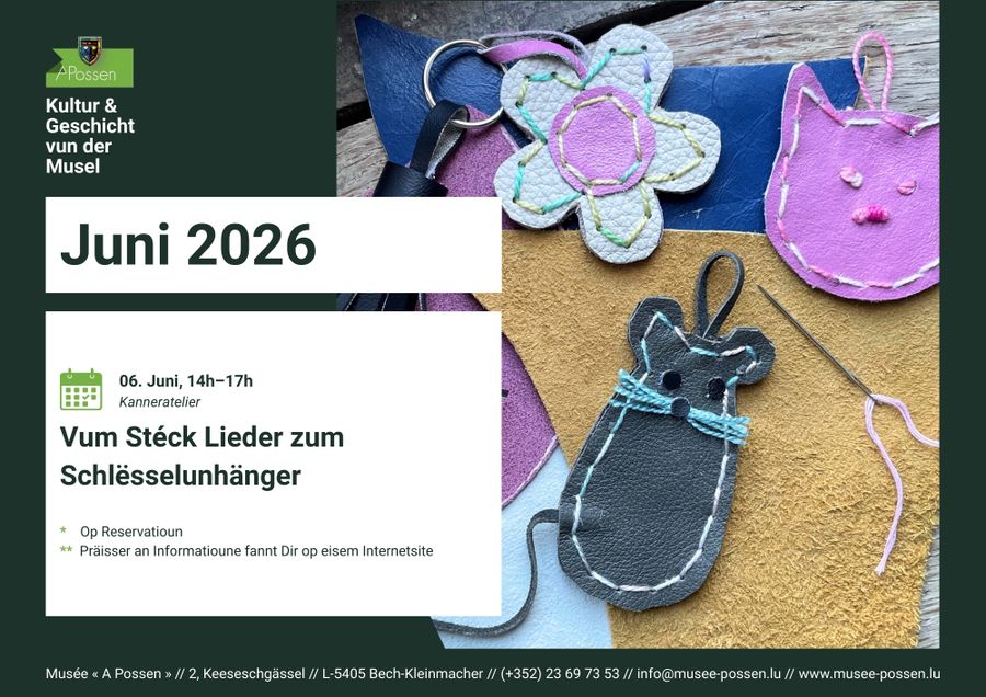 Le musée « A Possen » met en valeur dans son exposition le savoir traditionnel du cordonnier et le travail du cuir. Le 6 juin, les enfants de 6 à 12 ans, accompagnés d’une médiatrice, exploreront ce noble matériau de manière ludique. Dans une atmosphère conviviale, ils pourront dessiner, découper, coudre et coller, afin de créer un porte-clés unique et original.
