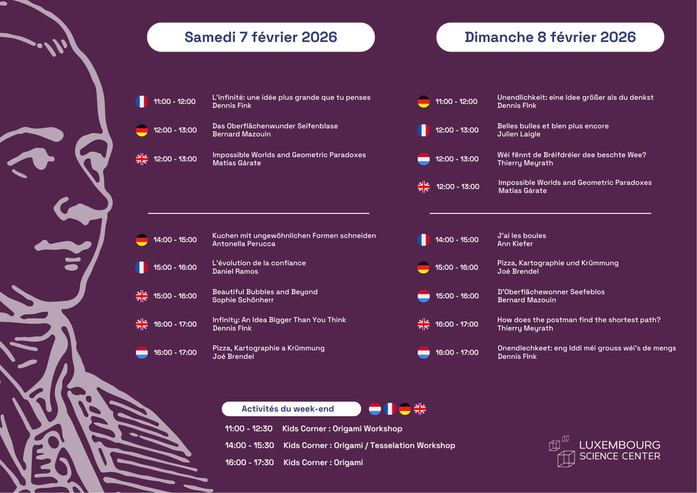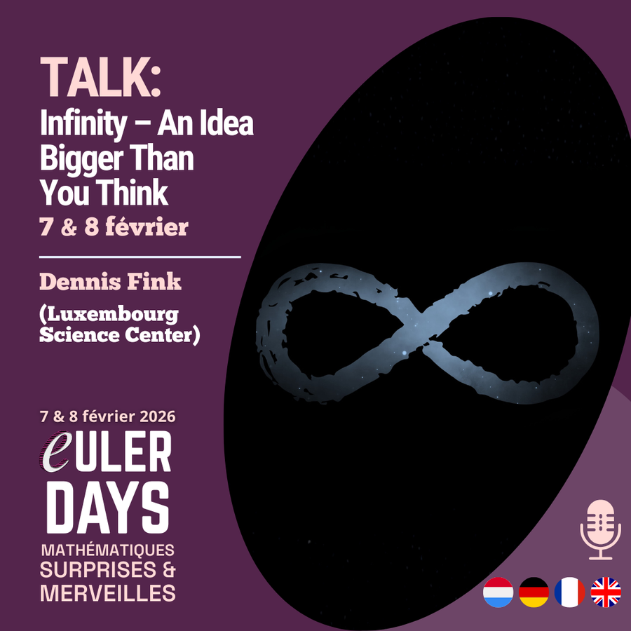 - TALK : L‘infinité – une idée plus grande que tu penses – "Découvrez un monde où les chiffres sont infinis et où l'intuition est constamment remise en question" (Dennis Fink – Luxembourg Science Center) – FR & EN
