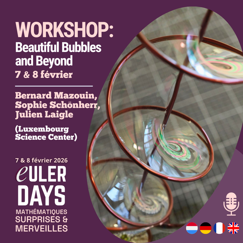 - WORKSHOP : Beautiful Bubbles and Beyond – "Des bulles de savon peuvent prendre des formes inattendues" (Bernard Mazouin, Sophie Schönherr, Julien Laigle – Luxembourg Science Center) – FR, LU, DE & EN