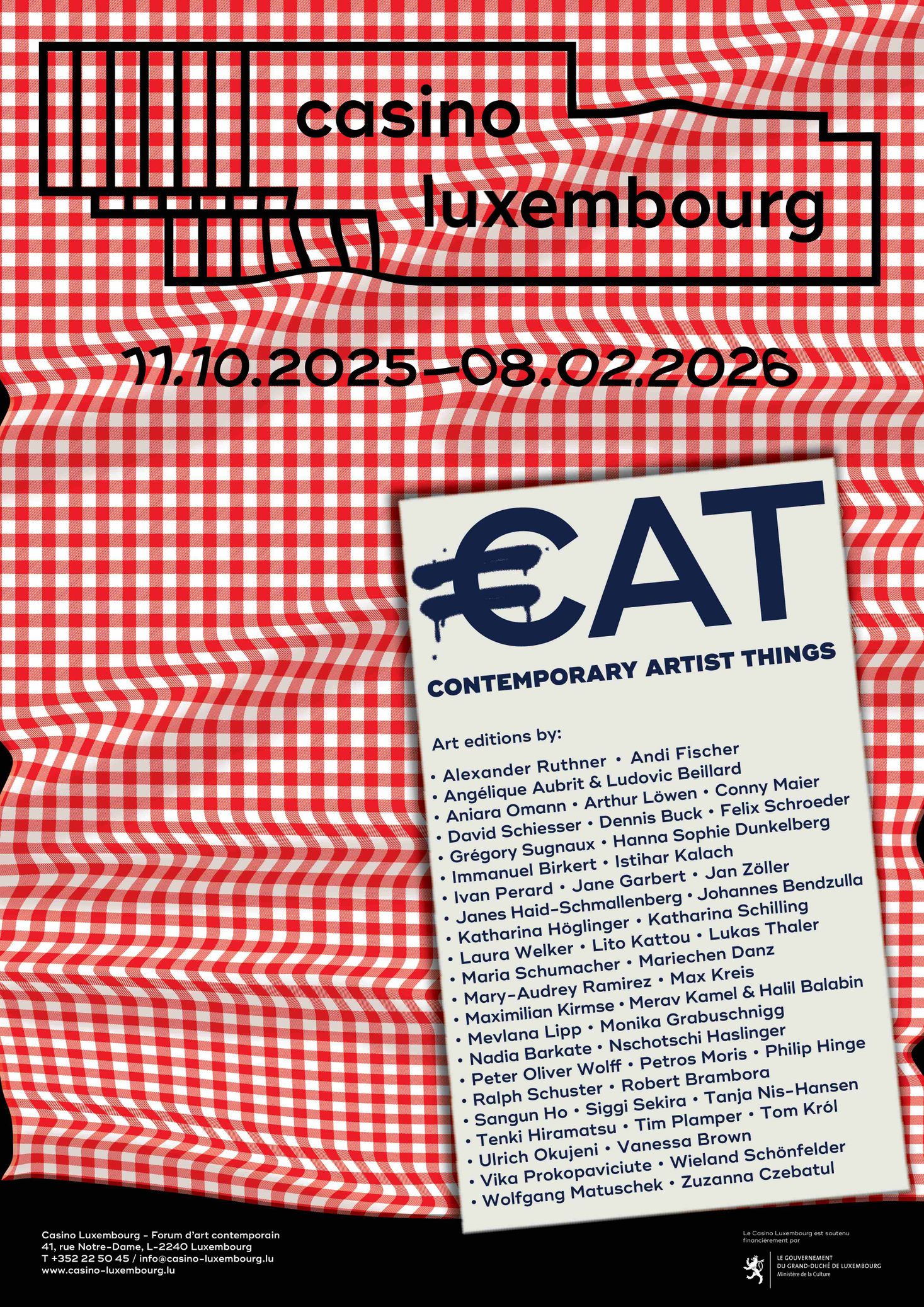 Pendant la pandémie, Nora Cristea .et Vincent Schneider, un duo de designers et de curateurs basé à Berlin, ont développé la plateforme artistique en ligne CAT (Contemporary Artist Things) dans le but de donner de la visibilité et du soutien à la scène émergente de l'art contemporain. Avec l'exposition €AT, le Casino Luxembourg – Forum d'art contemporain déplace cette initiative curatoriale dans l'espace institutionnel, offrant ainsi aux artistes une nouvelle visibilité.