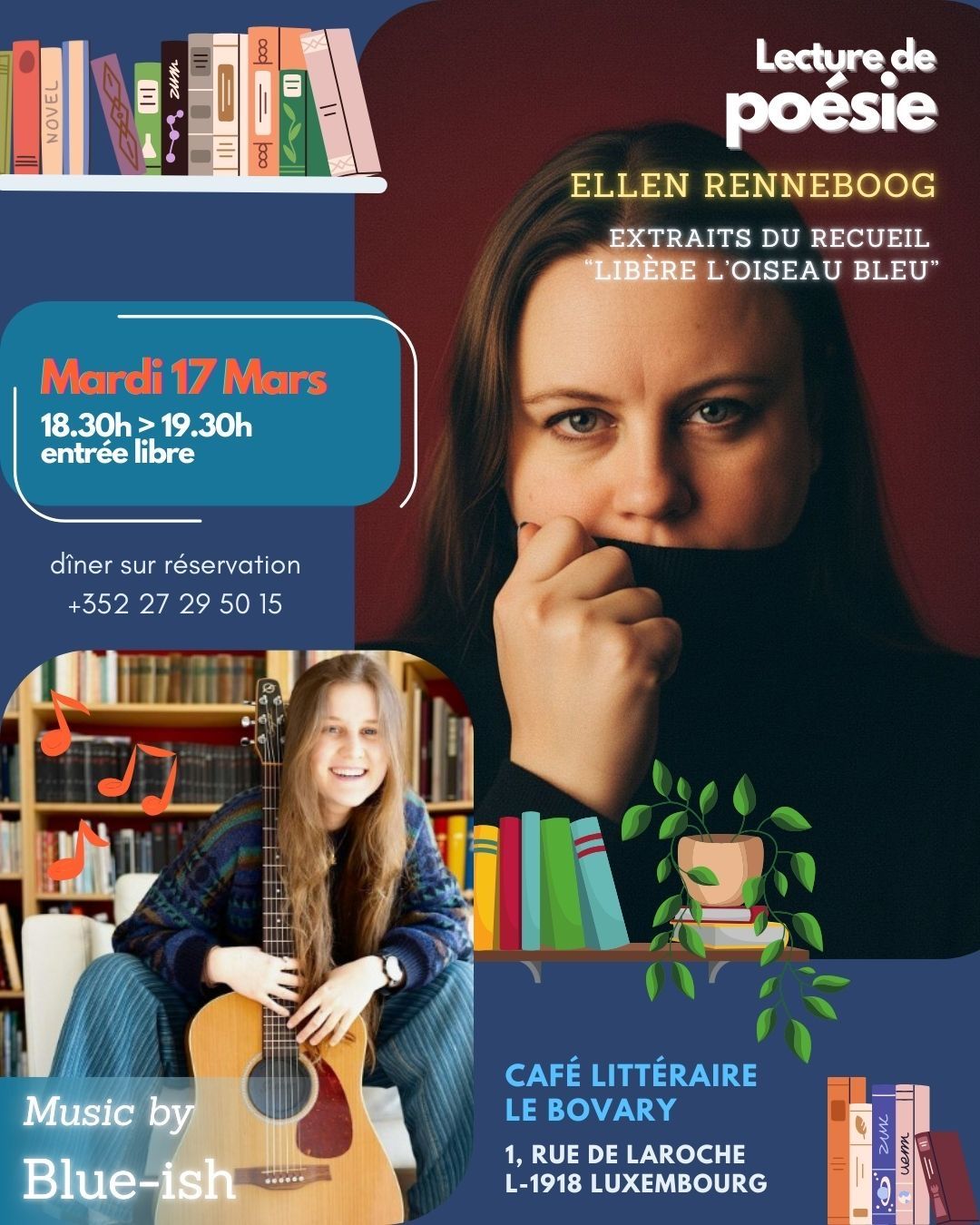 Lecture de poèmes extraits du recueil « Libère l’oiseau bleu » paru aux éditions Phi. Accompagnement musical par Blue-ish (chant et guitare acoustique). Possibilité de réserver le dîner par la suite.