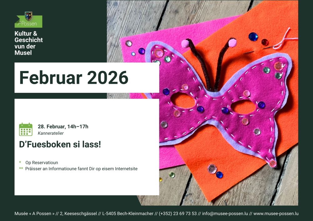 Réservation obligatoire par téléphone au +352 23 69 73 53 ou par email à info@musee-possen.lu