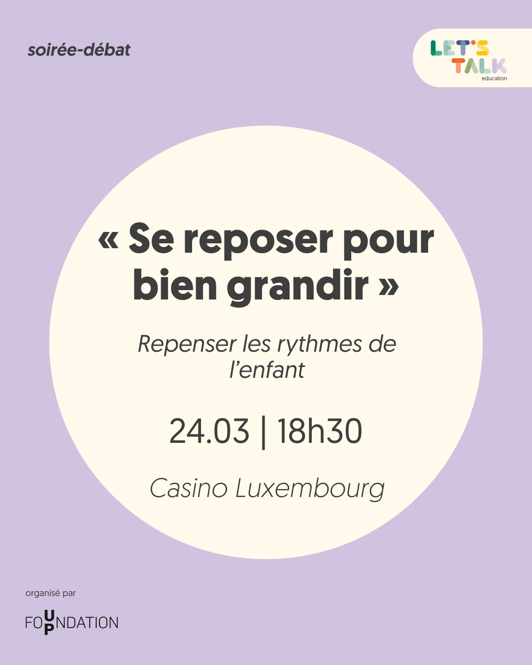 À travers une série de « flashs d'inspiration » de 10 minutes, cette soirée invitera à réfléchir collectivement à la place du calme et du repos dans la vie des enfants, ainsi qu'aux moyens de mieux répondre à leurs besoins fondamentaux.