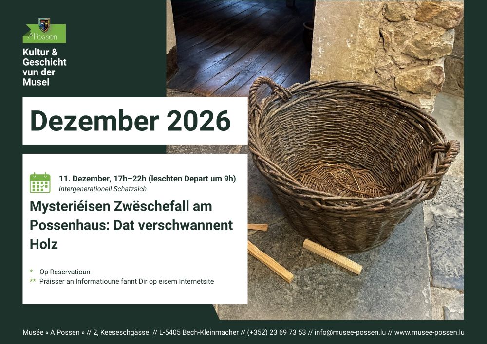 Dans le village de Bech-Kleinmacher, les habitants du Possenhaus sont de retour chez eux… mais en poussant la porte de leur maison, une terrible découverte les attend : le panier à bois est vide !