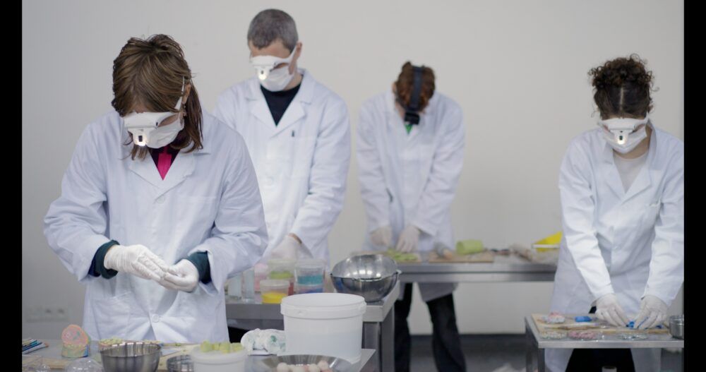 Dans ce contexte, d’énigmatiques objets en céramique évoquant des organes internes sont produits, examinés et minutieusement dessinés. Ces gestes agissent comme une forme de documentation, faisant écho aux méthodes historiques d’étude et d’observation anatomiques, et se déploient dans ce qui semble être un environnement pédagogique. Par la répétition, les actions accomplies par les participant·e·s se ritualisent, contribuant à instaurer une atmosphère à la fois discrètement mystérieuse et résolument ordinaire.