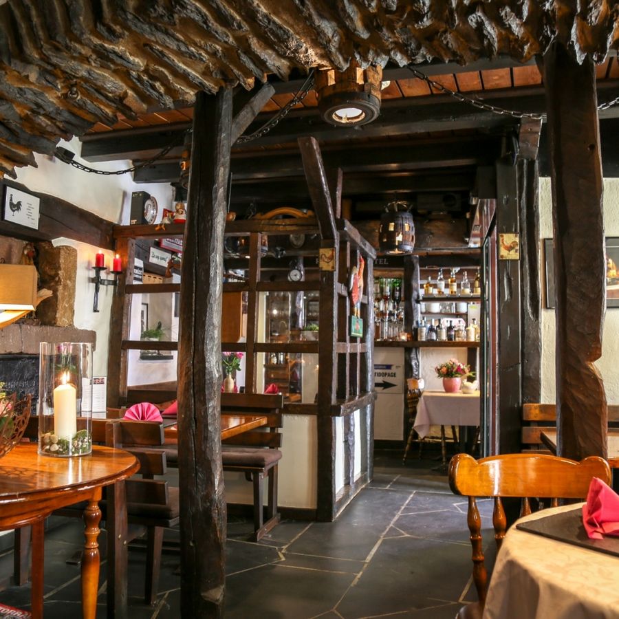 Restaurant à Vianden avec spécialités de viande grillée au charbon de bois dans un cadre rustique.