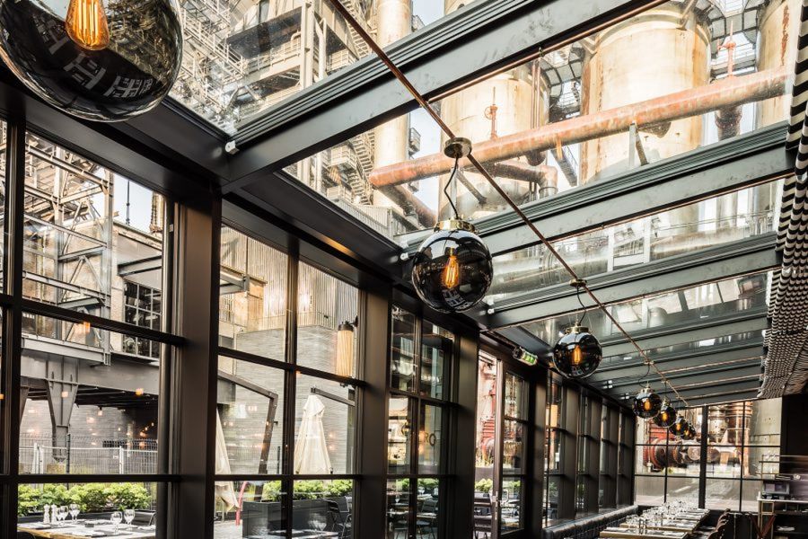 Le jeu de transparences avec les immenses baies vitrées du sol au plafond, se fondent avec les structures industrielles de Belval.