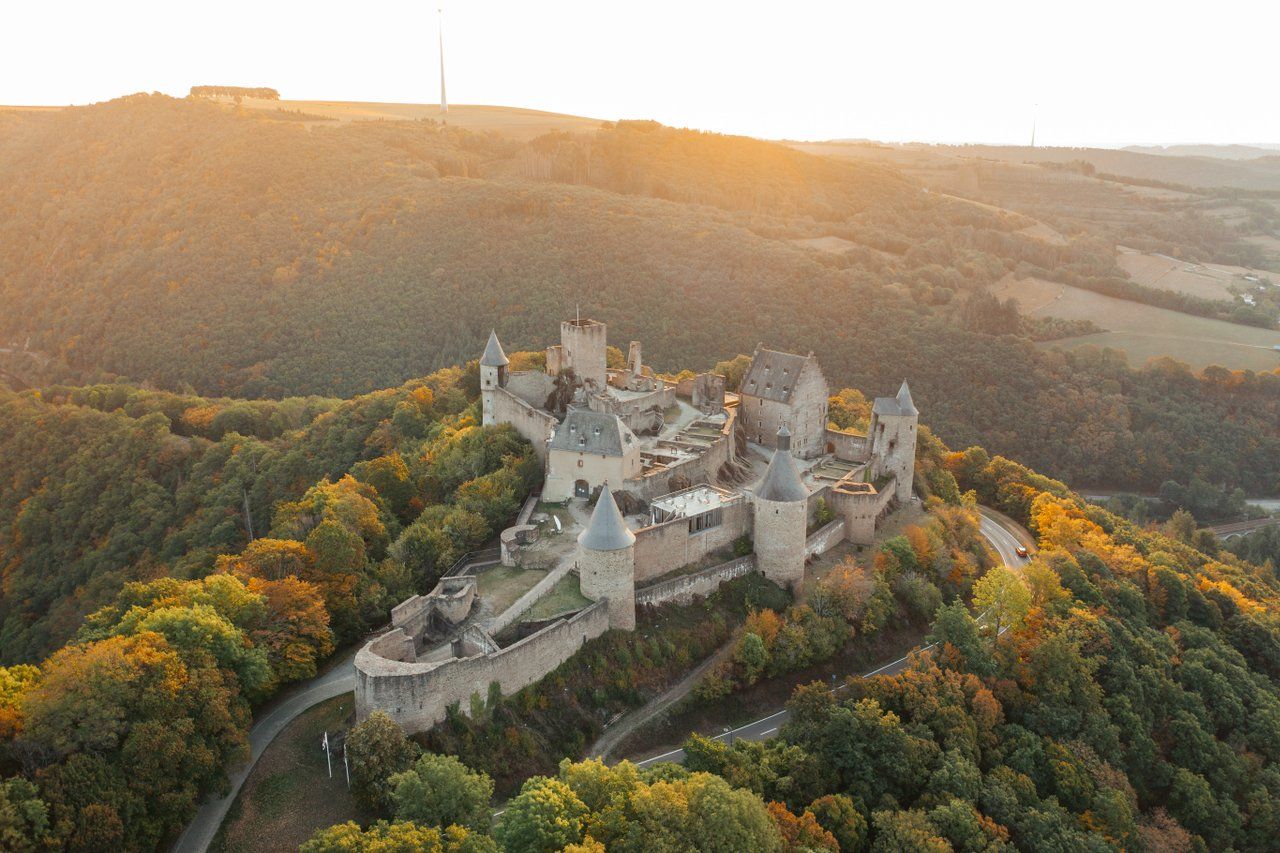 La randonnée se poursuit ensuite vers l'est. Vous atteignez rapidement le point de vue à la Schleedbësch, qui offre un panorama magnifique sur le château.
