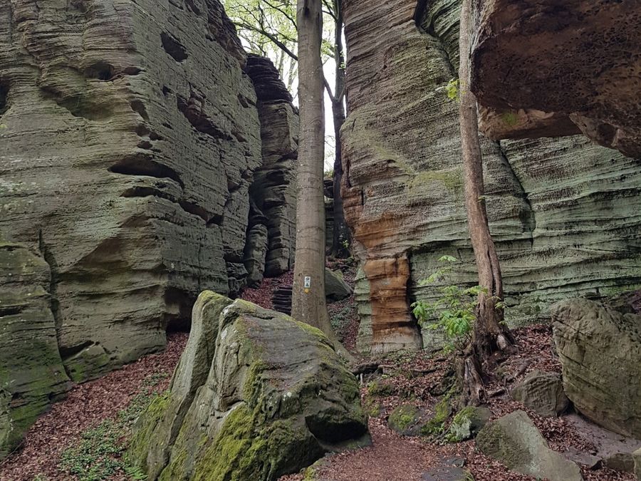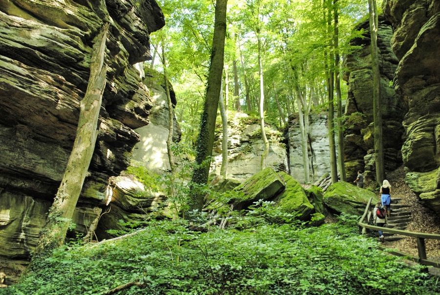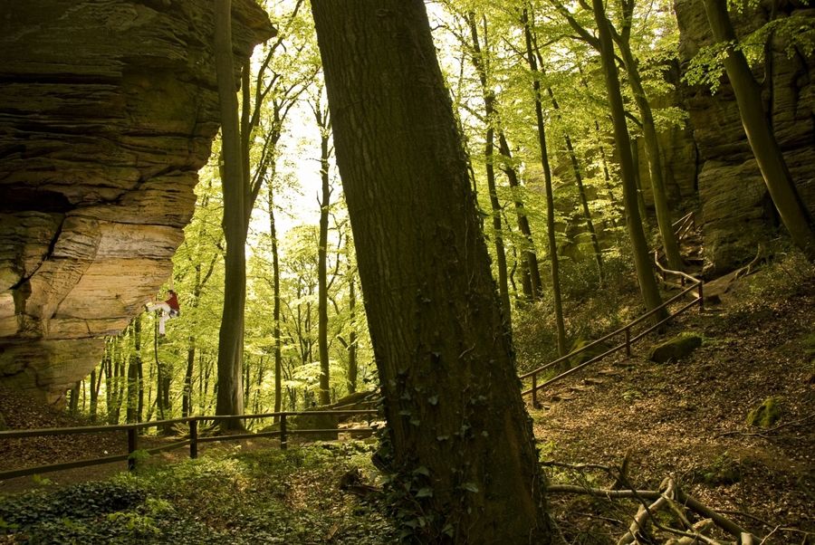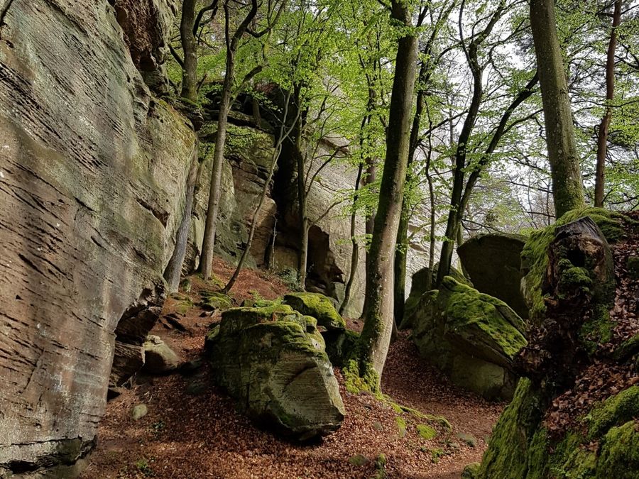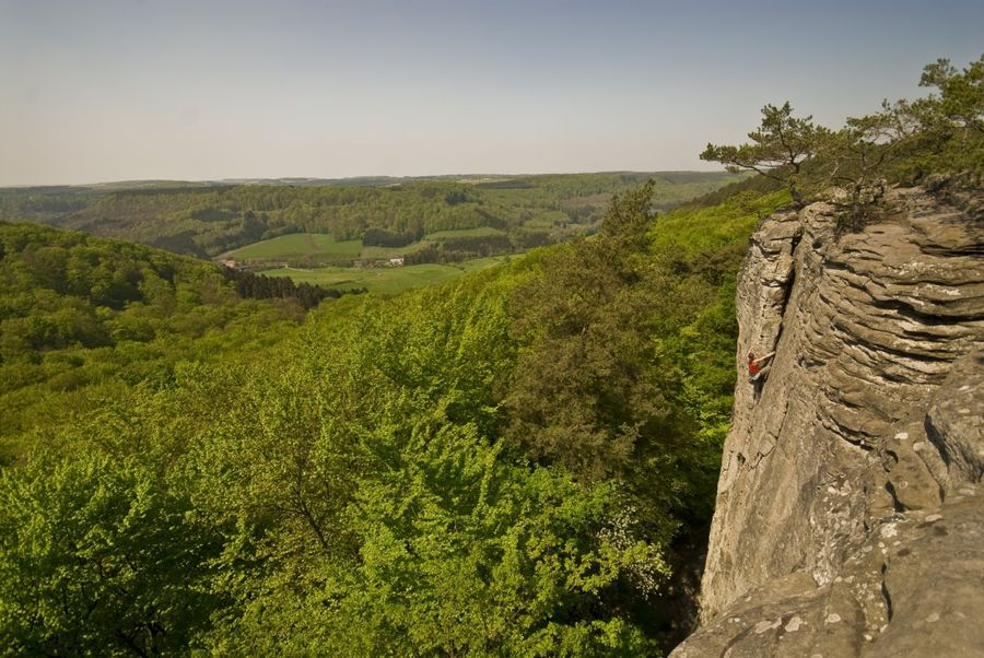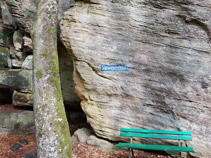 Il est recommandé de monter aux magnifiques points de vue Ruetsbechplateau ou Däiwelsinsel. Toutes ces curiosités absolument uniques sont rassemblées sur une superficie de moins de deux hectares. Pourtant, tu peux te consacrer à une exploration de plusieurs heures dans un décor de conte de fées. Le parcours de randonnée traverse un ancien chemin romain, suit sur le versant un sentier étroit le long de la chaîne rocheuse et se jette après environ 600 m dans la gorge du parc d'escalade Wanterbaach avec les célèbres Siweschléff en conclusion.
