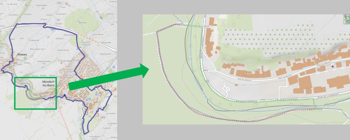 Le point de départ de ce parcours de randonnée circulaire se situe sur la place « Bei der Albaach » (26-28, Avenue Frantz Clément). Le chemin suit ensuite la rivière « Gander », qui constitue la frontière naturelle entre Mondorf-les-Bains et Mondorff (F) jusqu'aux thermes. Vous arrivez ensuite dans un splendide parc de 40 hectares, où se trouvent le musée de l'avion dans le pavillon « Source Kind » et le « Waasserhaus », aujourd'hui un cinéma. Suivez ensuite la rue principale jusqu'au « Wouerbesch », un lieu propice à la détente et au repos. Le parcours continue le long de la route jusqu'au village voisin d'Altwies, où vous pourrez profiter du magnifique environnement verdoyant. Une fois arrivé au Kastell, suivez la rivière frontière jusqu'au point de départ.