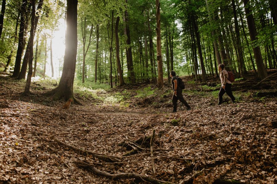 Près de la « Huellée » se trouve une imposante table de pique-nique avec vue sur le château de Schoenfels. En continuant la promenade, tu atteins le lieu de détente « Hunnebur », un endroit où plusieurs bancs entourent l’étang féerique pour se relaxer au cœur de la nature. En fin de parcours, on traverse la petite gorge intacte « Wollefsgriecht ».