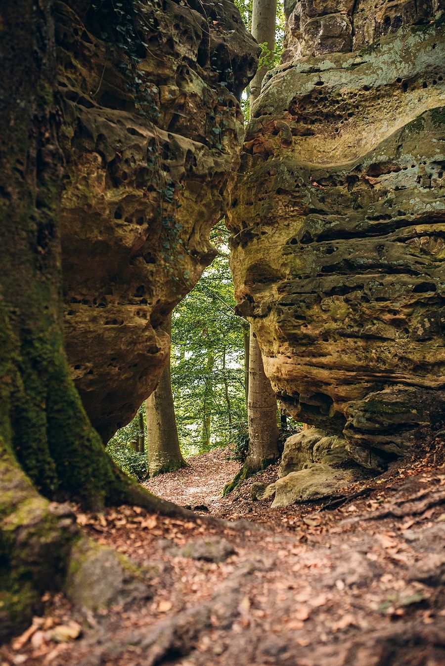 Dans la forêt entre Mersch et Schoenfels se cachent d'impressionnantes formations rocheuses et de grottes qui font battre le cœur de tout amoureux de la nature plus fort.