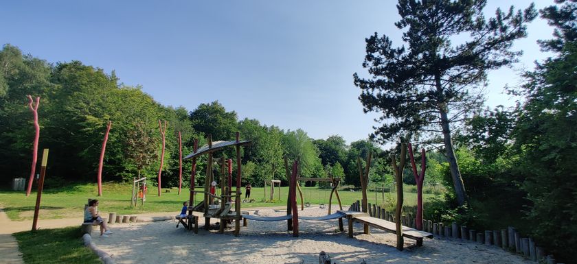 Dans cette section, vous randonnez à travers la réserve naturelle "Kiemerchen-Scheiergronn-Groussebësch", qui est adjacente au "Gaalgebierg" de Belvaux. En chemin, vous verrez encore des formations rocheuses rouges et des traces de l'extraction du minerai. Une partie du parcours passe sur un ancien circuit d'essai pour pneus de voiture, qui ressemble aujourd'hui à une portion d'autoroute abandonnée. La nature y revendique son espace avec ténacité et continuellement. Le parcours traverse ainsi presque exclusivement une vaste zone forestière. Sur le Gaalgebierg, il y a une grande aire de jeux où vous trouverez aussi des emplacements accueillants pour pique-niquer.