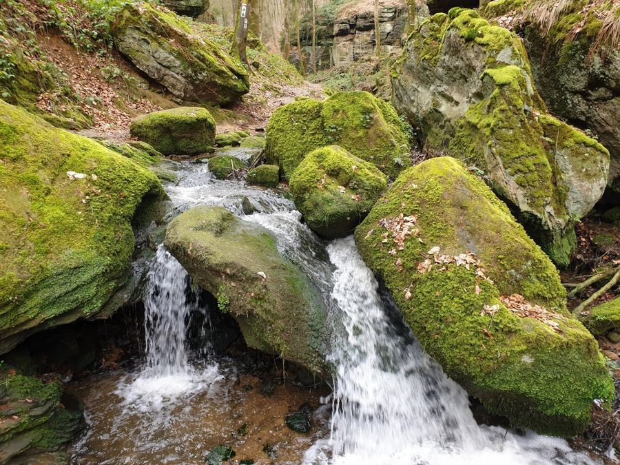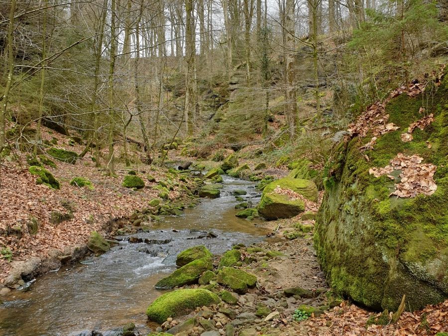 Vers la fin du parcours, on arrive dans les vallées romantiques et sauvages du Haupeschbaach et du Halerbaach. Petits ponts en bois, mousse abondante et énormes blocs de pierre caractérisent le paysage. Le point d'orgue de la randonnée est la vue sur le château et l'étang situé devant.
