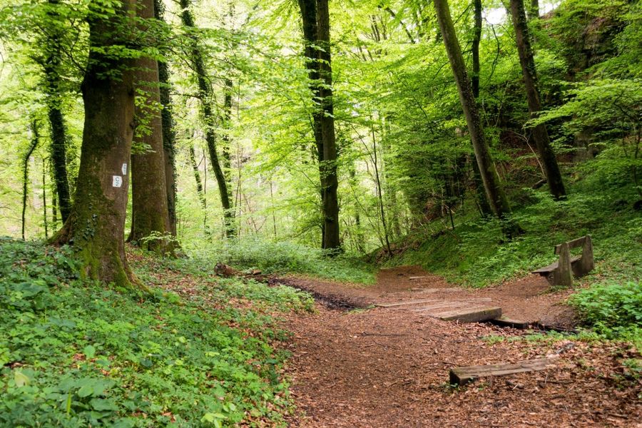 Le point de départ Op der Gare, ancien site de la gare, est marqué par l’installation d’une bombe volante américaine retrouvée à proximité datant de la Seconde Guerre mondiale. Le chemin traverse d’abord le village de Consdorf, passe devant quelques maisons paysannes typiques et la plus ancienne maison du village, construite en 1756 dans la rue Huelewee. À partir de là, on quitte la zone habitée et un sentier étroit traversant une prairie passe à côté d’une petite source, appelée communément Nidderbierchen ou Nidderbierchelchen, pour rejoindre la vallée de la Hârdbaach. Après quelques centaines de mètres en remontant le ruisseau sur un large chemin forestier, un sentier étroit et escarpé part à droite et mène aux passages rocheux très étroits Rittergang et Déiwepëtz. Le point culminant de cette randonnée est la spectaculaire traversée du passage rocheux complètement obscur Kuelscheier ainsi que l’exploration du fantastique site Adventure-Kuelscheier. Sur un chemin légèrement en montée, passant devant plusieurs tourbières dans la parcelle forestière Seitert, le point de départ est de nouveau atteint.