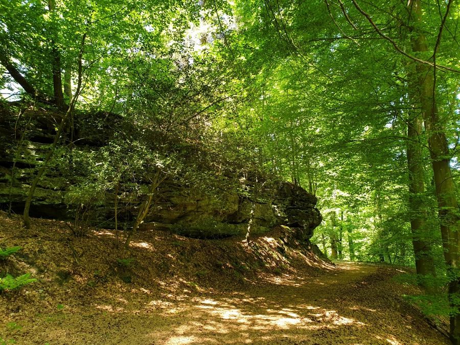 Ensuite, un ancien chemin creux traverse la forêt en montée. Le parcours serpente ensuite à nouveau vers la vallée, entouré de rochers. Par un chemin asphalté, on arrive aux étangs de Fischbach, qui offrent une possibilité de restauration.