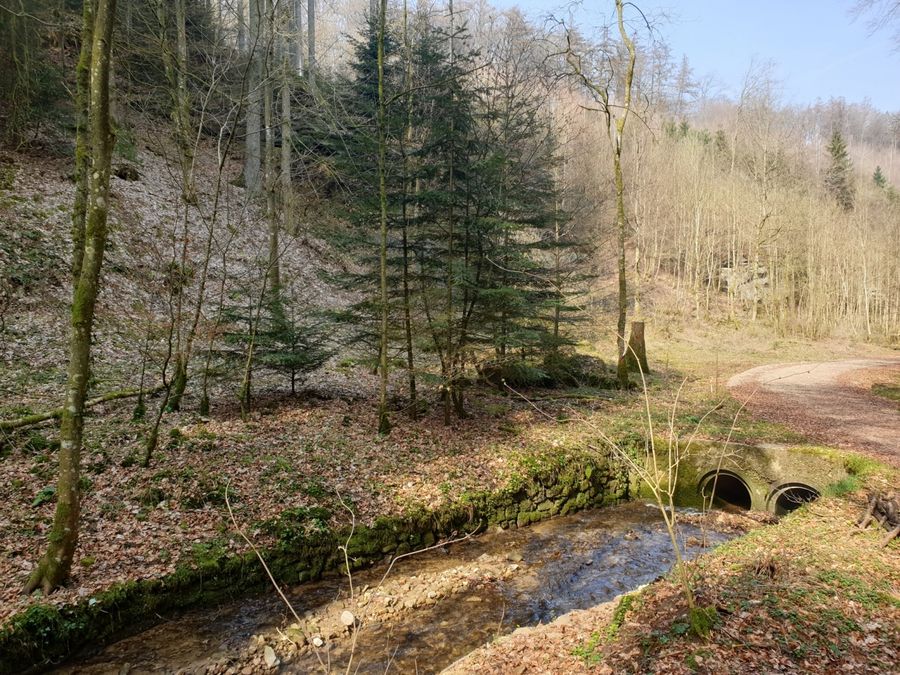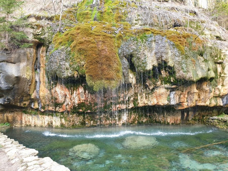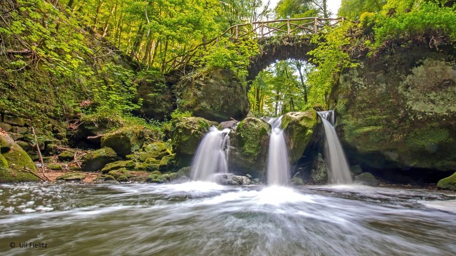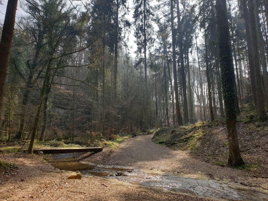 Un passage en bois vous conduit à la spectaculaire source de tuf calcaire, où un cours d'eau coule doucement sur une avancée rocheuse dans un étang clair comme du cristal. Le point d'orgue est l'emblème de la région de Müllerthal – Petite Suisse luxembourgeoise – le Schiessentümpel avec son pont de pierre pittoresque au-dessus de la petite cascade.