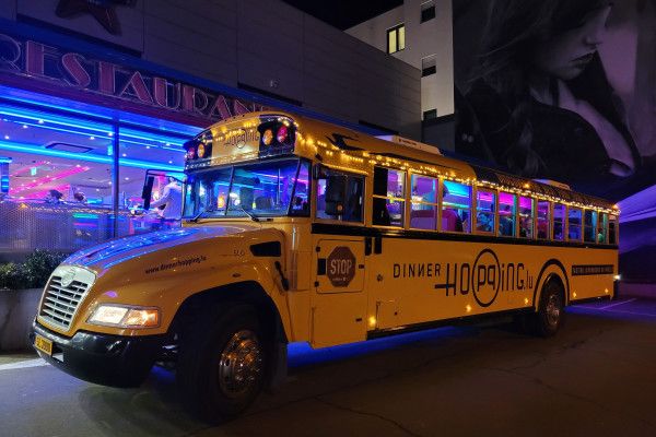 Dans notre bus scolaire américain unique (Dinner Hopping) que nous avons transformé en restaurant sur roues, vous rencontrerez d'autres clients de tous âges, certains par paires, d'autres en groupes ou individuellement. L'ambiance s'anime dès que le grand frein à main du bus est desserré : le départ approche ! Le concept du Dinner Hopping repose sur l'idée de passer d'un restaurant à l'autre, de savourer une variété de repas tout en traversant les plus belles rues du Luxembourg. Votre menu à trois plats sera servi par le personnel du restaurant à l'intérieur du bus. Pendant les 20 à 30 minutes de pause, vous pouvez quitter le bus si vous le souhaitez, pour prendre l'air ou utiliser les toilettes du restaurant.
