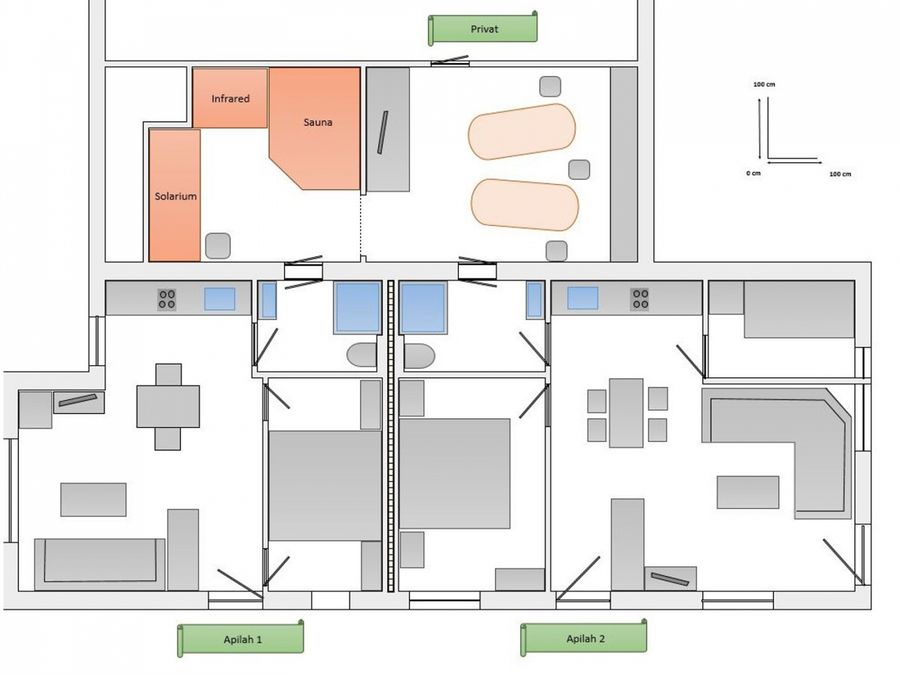 For your relaxation, our wellness oasis with a sauna, solarium, infrared cabin, and relaxation room is available, accessible directly from your apartment upon request.
