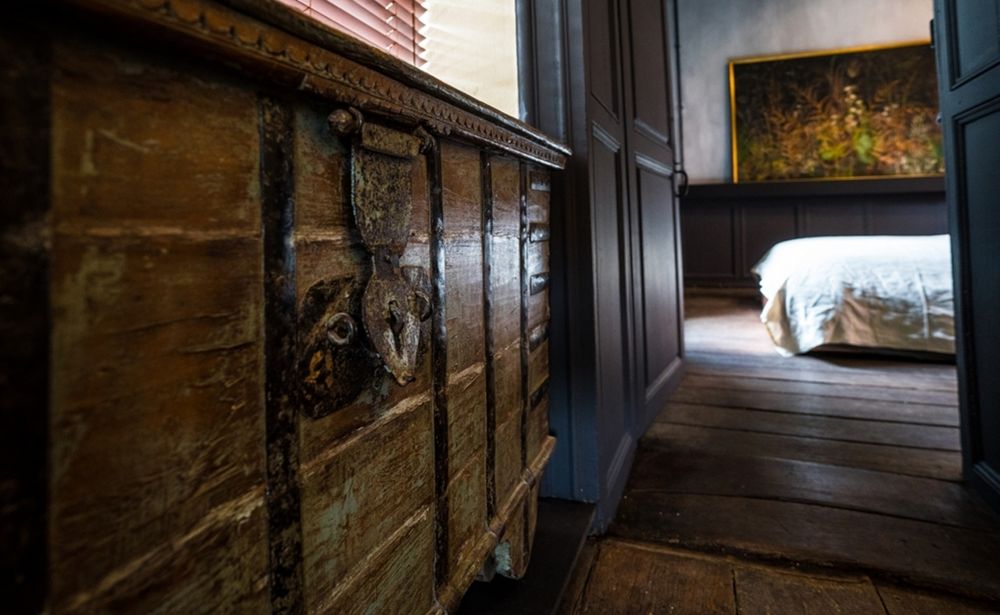 The "Sherlock" room: discover a cabinet of curiosities, a bathroom in the castle tower and an atypical copper island bed.