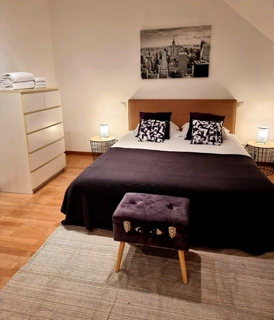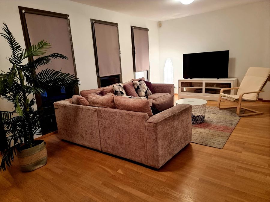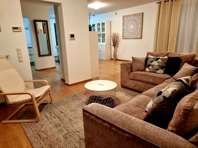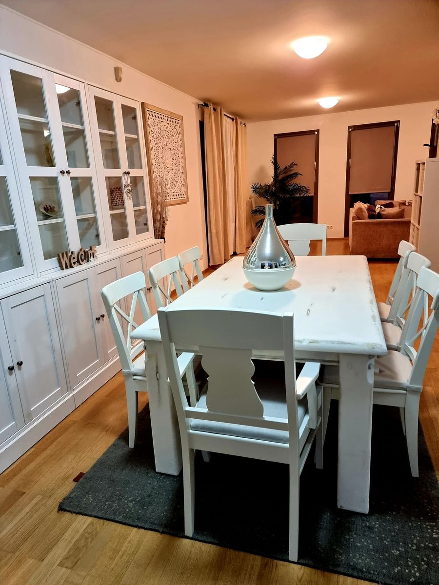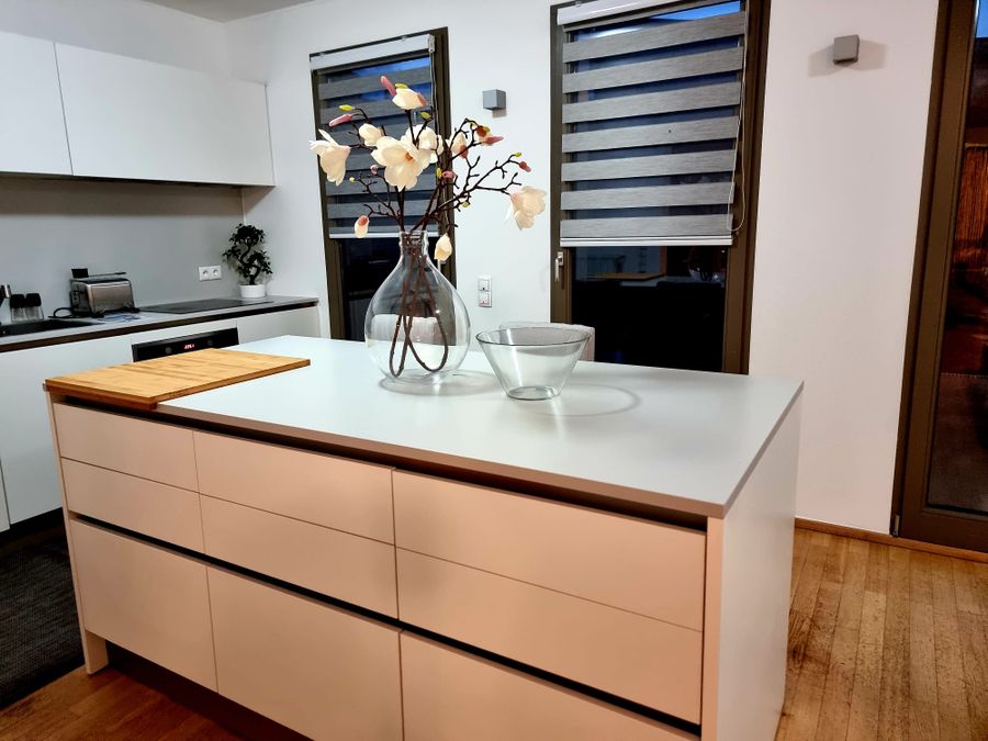 On the first floor you have the living area with a fully equipped kitchen (oven, refrigerator, dishwasher, coffee machine, …) with a cooking island open to the dining room and the living room with a sofa corner, TV as well as a direct access to the Privat terrasse and garden.