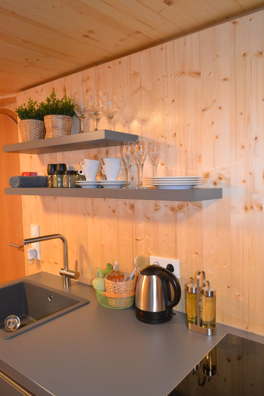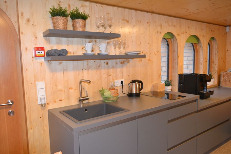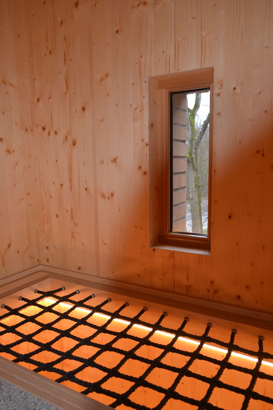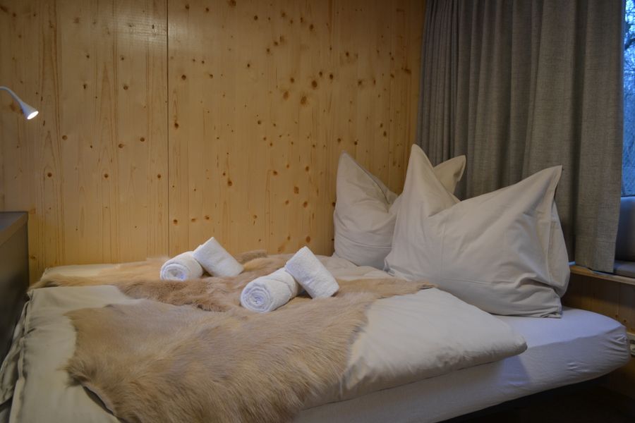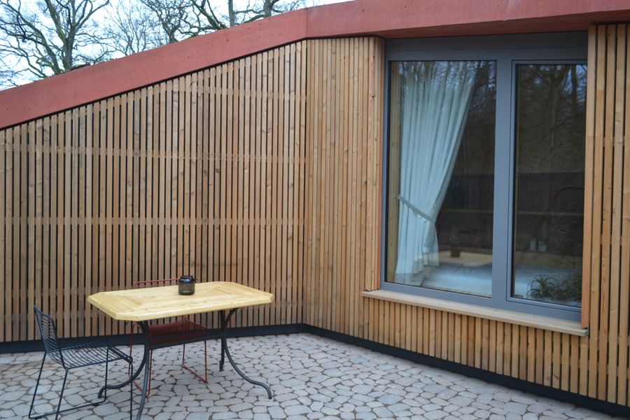 The entrance is embellished with a sculpture designed like a gate and a walkway of iron ore spiked rock, showing the closeness to the region's ore processing past. The entire outdoor area made of wood was designed together with an artist and is intended to reflect the interior of the gîte - also primarily made of wood.
