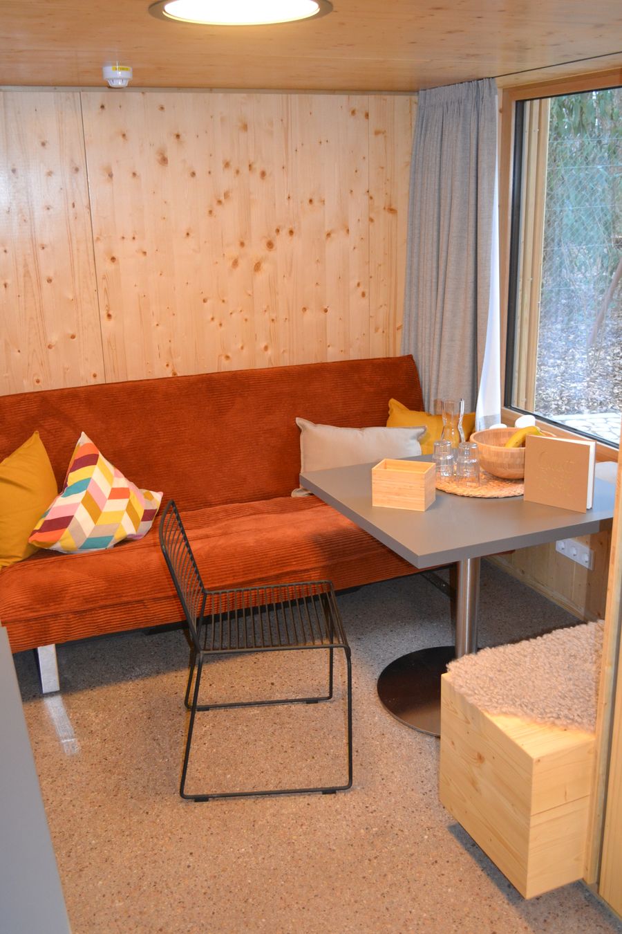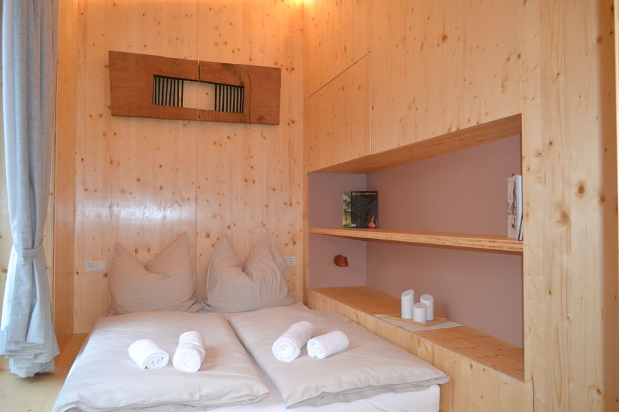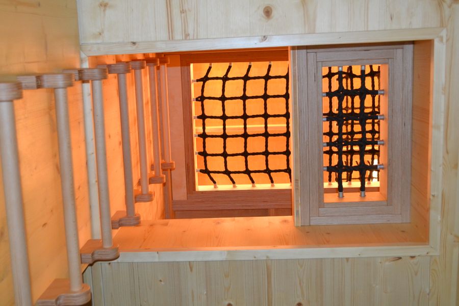 The interior of the fairytale castle is kept simple and practical, storage space for suitcases can be found below the four beds for instance. An aviary opens the "Kabaischen" to the park and enables an even closer connection to the animals in the park.