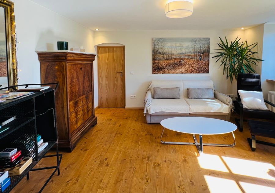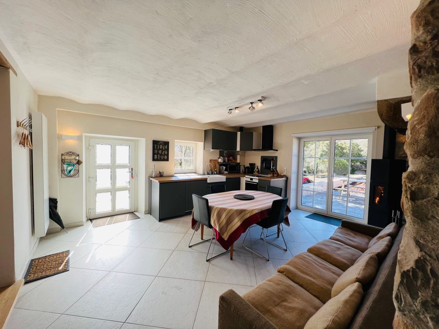Kitchen: The entrance to the apartment leads you directly into a large, bright and modern kitchen with a wooden table and sofa. There is a wood-burning fireplace that heats almost the entire apartment quickly and comfortably and creates a very cozy atmosphere. From the kitchen you have direct access to the large living room as well as the bathroom or storage room. Part of the kitchen is the double glass door to the west, which offers access to the terrace and garden.