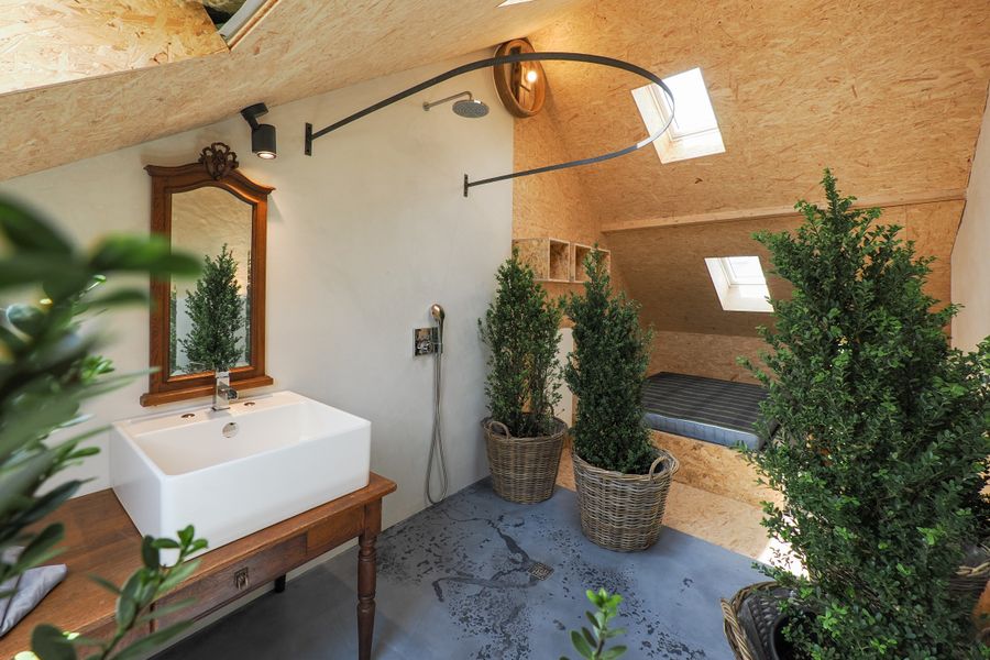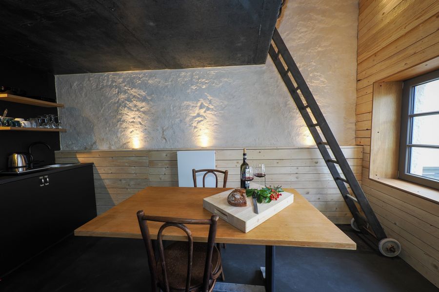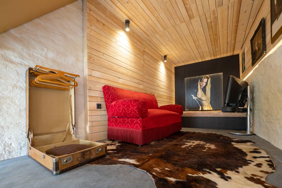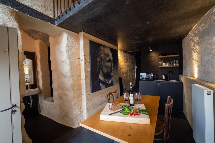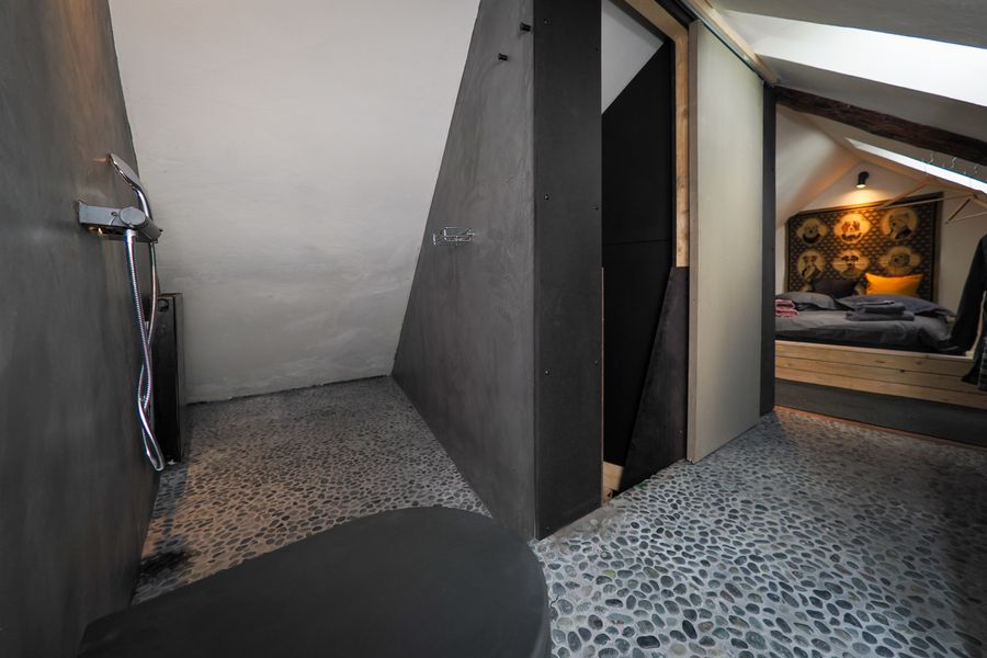 The owners have designed the concept with great love to detail. In the Man’s Cave, a beautiful antique spiral staircase leads to the sleeping area. The bathroom is designed in a cave style with a sit-down shower in the bathtub – playful and unique. Guests share a large living room, a kitchen, an office and the garden. There is also a sauna.
