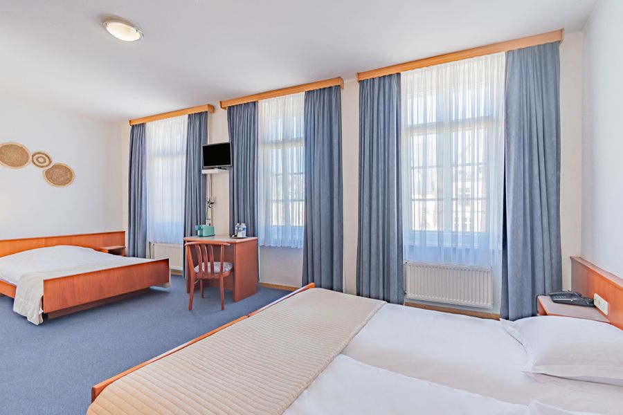 Die Zimmer sind modern. Viele bieten den Blick auf den Marktplatz sowie auf eines der geschichtsträchtigsten Gebäude der ältesten Stadt Luxemburgs, den Denzelt.