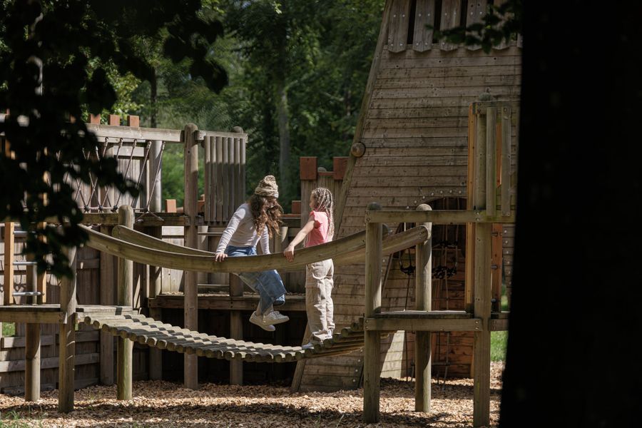 Dieser Spielplatz fügt sich mit seinem natürlichen Braun der Holzbauten harmonisch in die grüne Umgebung ein. Hier können Kinder nicht nur die Spielgeräte, sondern auch die Natur genießen. Kleine Wunder umgeben sie: Blumen, Pflanzen und die Ruhe und Stille des Waldes, nur unterbrochen von den glücklichen Stimmen der Kinder.