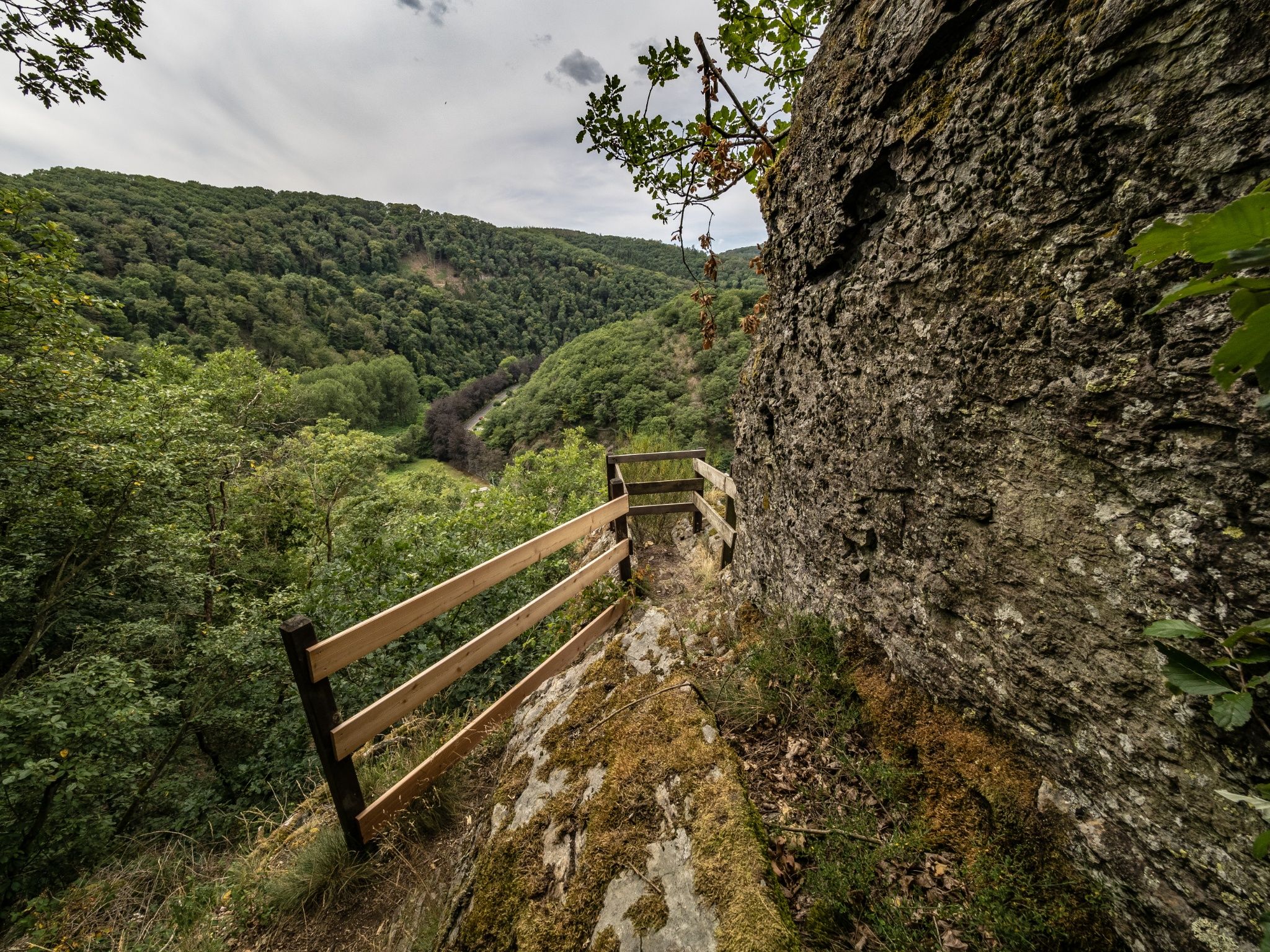 Er startet am Kulturzentrum in Bürden und begibt sich bergab in Richtung Sauertal. Am Steilufer macht er kehrt. Schnell erreichen Sie die Scharflee. Dieser Aussichtspunkt am gleichnamigen Felsen bietet einen tollen Blick auf die Burg Bourscheid und das Sauertal.
