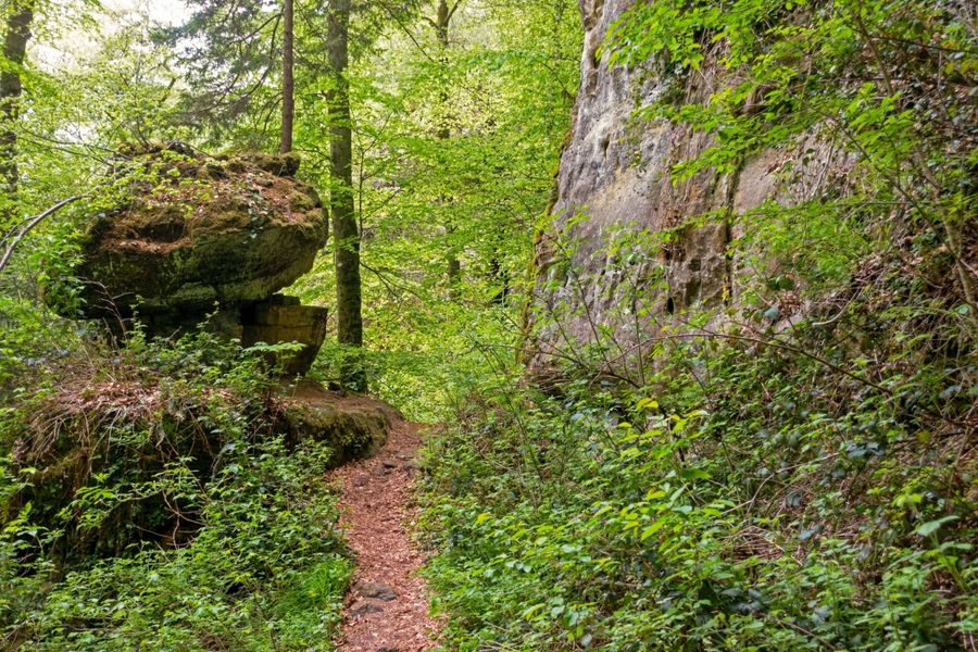 Der Startplatz Op der Gare, früheres Bahnhofgelände, ist gekennzeichnet durch die Aufstellung einer in der Nähe geborgenen US-Fliegerbombe aus dem Zweiten Weltkrieg. Der Weg führt zunächst durch die Ortschaft Consdorf, vorbei an einigen typischen Bauernhäusern und an dem ältesten, im Jahr 1756 erbauten Haus des Ortes in der Straße Huelewee. Ab hier verlässt man bebautes Gebiet und ein schmaler Wiesenpfad führt vorbei an einer kleinen Quelle, im Volksmund Nidderbierchen oder auch Nidderbierchelchen genannt, ins Tal der Härdbaach. Nach ein paar Hundert Metern bachaufwärts über einen breiten Waldweg zweigt ein schmaler, stufenreicher Pfad nach rechts ab und führt zu den sehr engen Felspassagen Rittergang und Déiwepëtz. Den absoluten Höhepunkt dieser Wanderung stellt die spektakuläre Durchquerung der stockfinsteren Felspassage Kuelscheier sowie die Erkundung des fantastischen Geländes der Adventure-Kuelscheier dar. Auf leicht ansteigender Wegführung, vorbei an mehreren Mooren in der Waldparzelle Seitert, ist der Ausgangspunkt wieder erreicht.