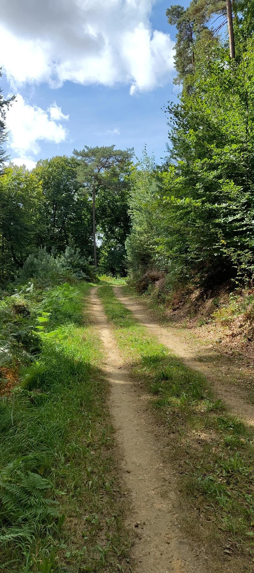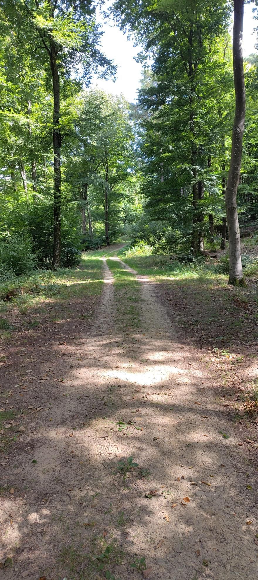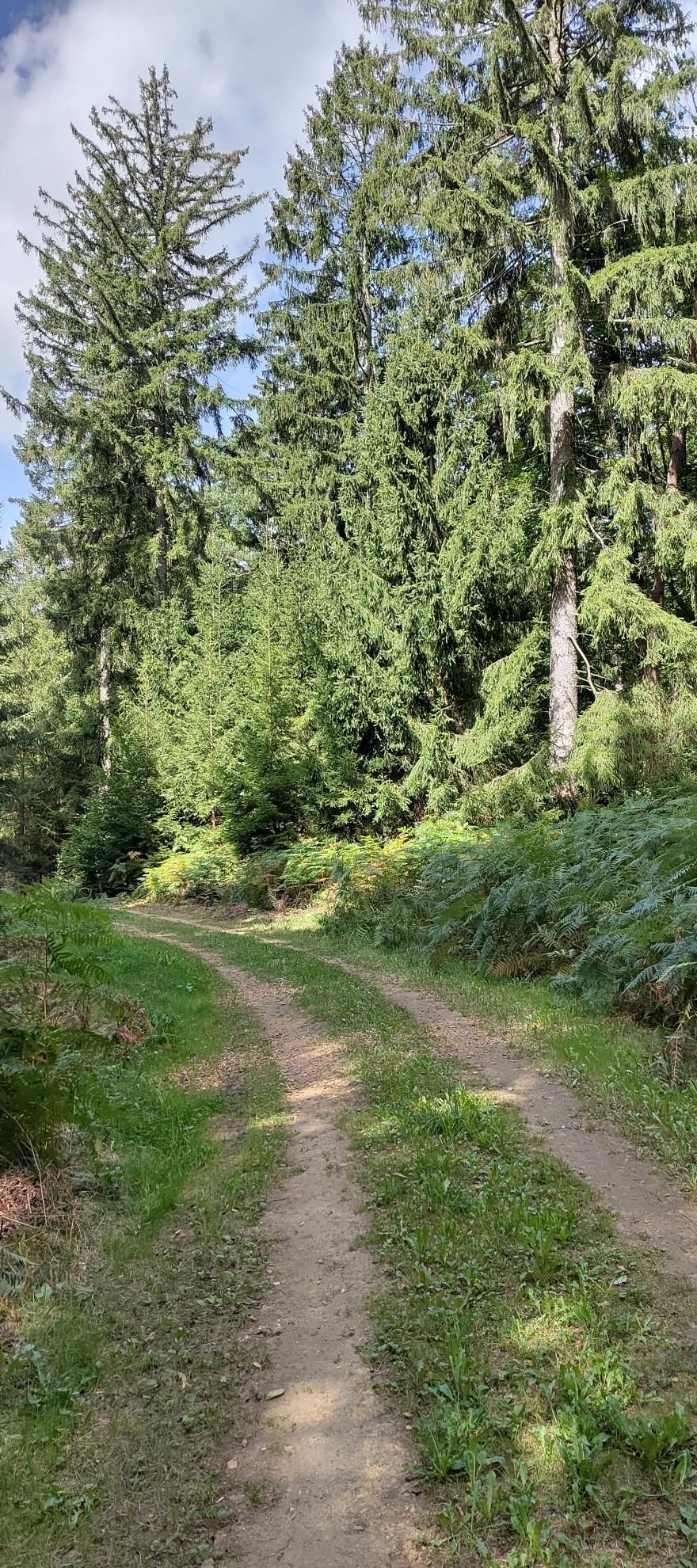Der Weg beginnt in Angelsberg und führt zunächst an einem alten Wegkreuz vorbei, bevor er über offene Felder in den Wald hineinführt. Auf breiten Waldwegen schlängelt sich die Strecke durch das dichte Grün, gesäumt von markanten Felsformationen, die teils frei im Gelände liegen. Anschließend geht es über die Straße, vorbei an Feldern, zurück zum Ausgangspunkt.