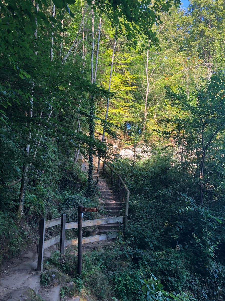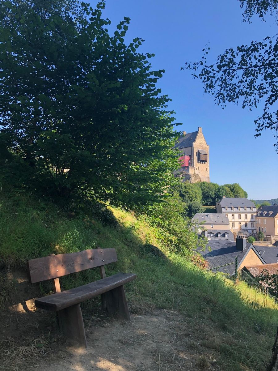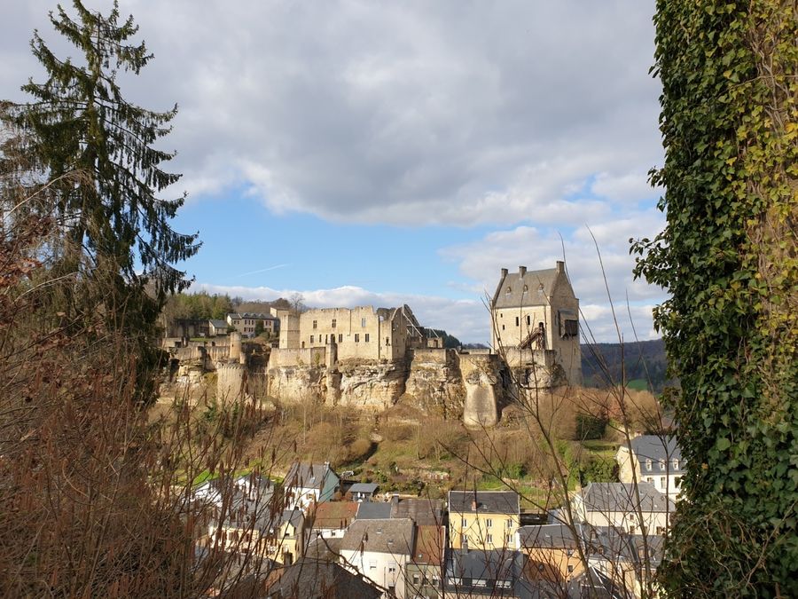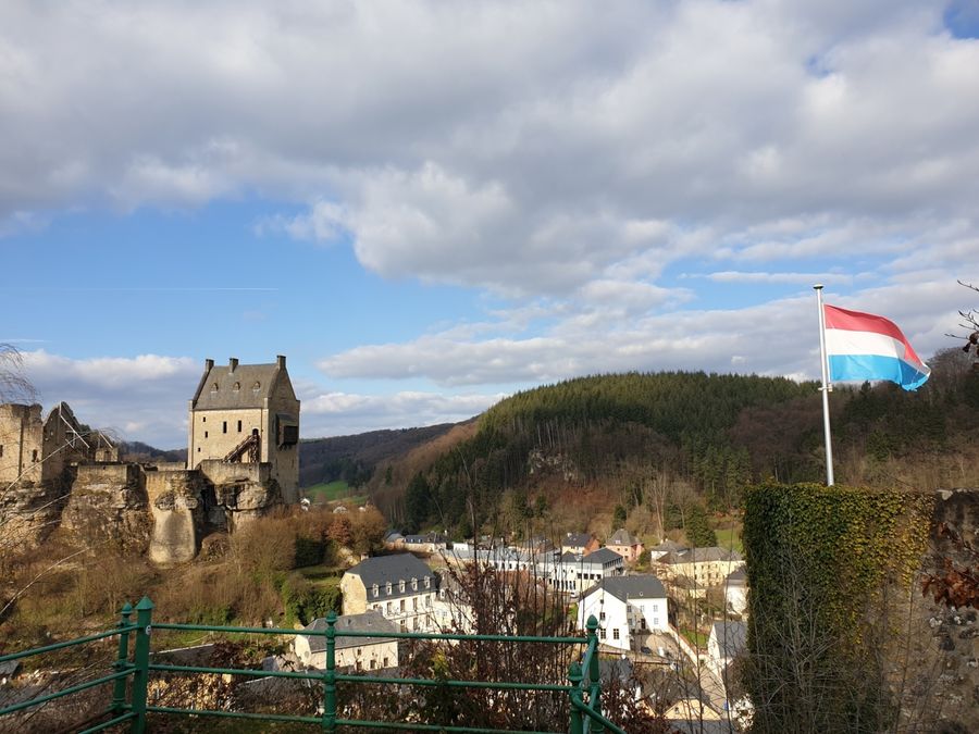 Am Ende der Wanderung gelangt man zum Aussichtspunkt Verluerekascht bei Larochette. Dort wird man mit einem imposanten Blick auf die Stadt und die gegenüberliegende Burgruine belohnt.