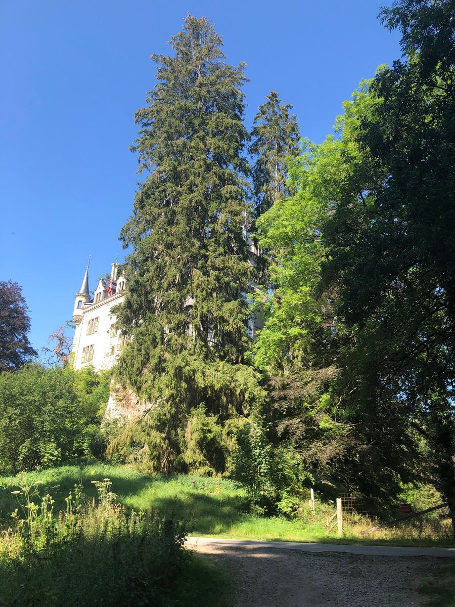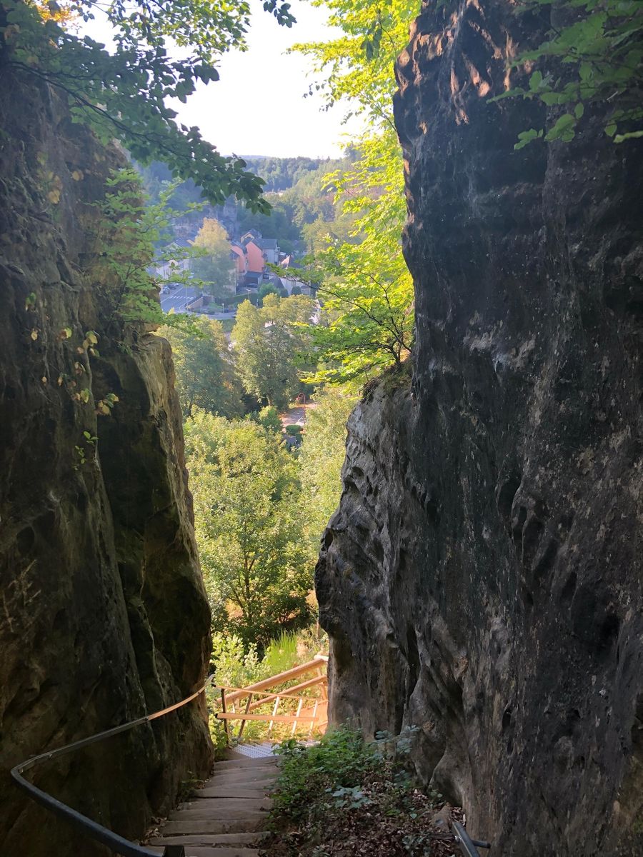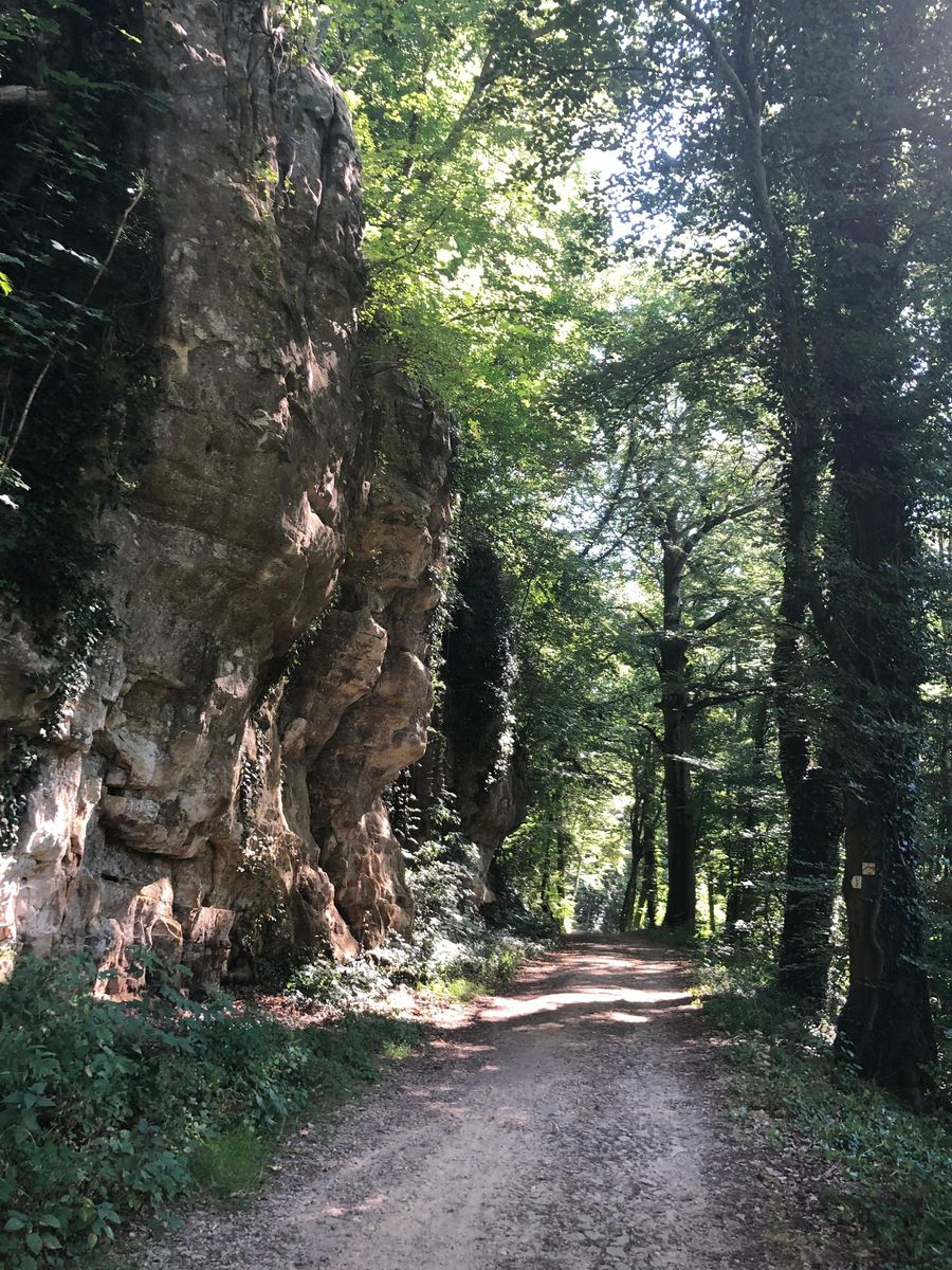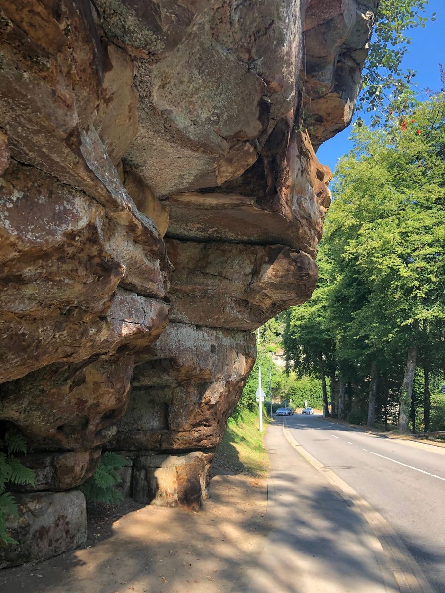 Am Ende der Wanderung gelangt man zum Aussichtspunkt Verluerekascht bei Larochette. Dort wird man mit einem imposanten Blick auf die Stadt und die gegenüberliegende Burgruine belohnt.