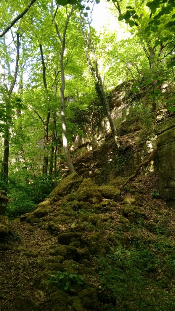 In het noordwesten veroorzaakten de wateren van de Sûre een aardverschuiving als gevolg van erosie aan de voet van de helling. In het onderste gedeelte van de beboste helling is mergelgrond, een steensoort die bestaat uit een mengsel van kleimineralen en dolomiet. In de mergel ligt gips, dat hier in vroegere tijden werd gewonnen. Het bovenste deel van de helling wordt gevormd door dolomiet, dat een steile rotswand vormt. Voor de rotswand liggen talrijke dolomietblokken, die werden losgemaakt door het glijden van de rotswand. Een van de verticale spleten in de dolomietmuur, "Kimmhaischen" genoemd, voert naar een grot, die volgens een legende wordt bewoond door de "Kimmfrächen". Deze spookachtige vrouw moet ijverig spinnen aan haar wiel, en er wordt gezegd dat men haar kan horen als men zijn oor op de rots te luister legt. In het voorjaar en de zomer kan het zijn dat de spookvrouwe haar ondergrondse kamer verlaat, en met haar spinnenwiel boven op het “Kimmhaischen” gaat zitten, en al spinnend een oud lied zingt. Soms kan men dit lied horen.