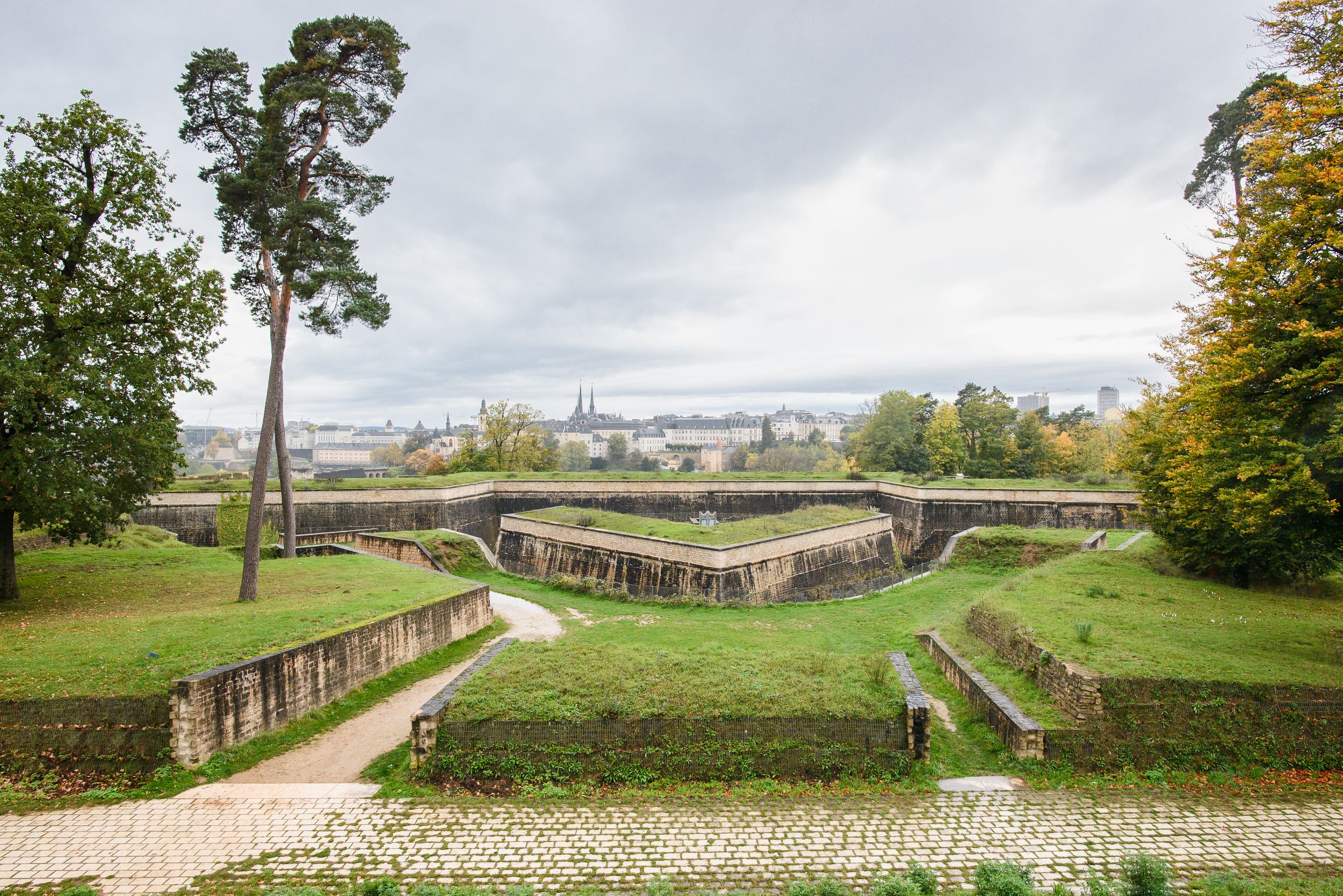 Het park van het Musée Dräi Eechelen is vol geschiedenis, want op de achtergrond is het gelijknamige museum te zien, dat is gevestigd in een gerestaureerd en gedeeltelijk herbouwd deel van Fort Thüngen.