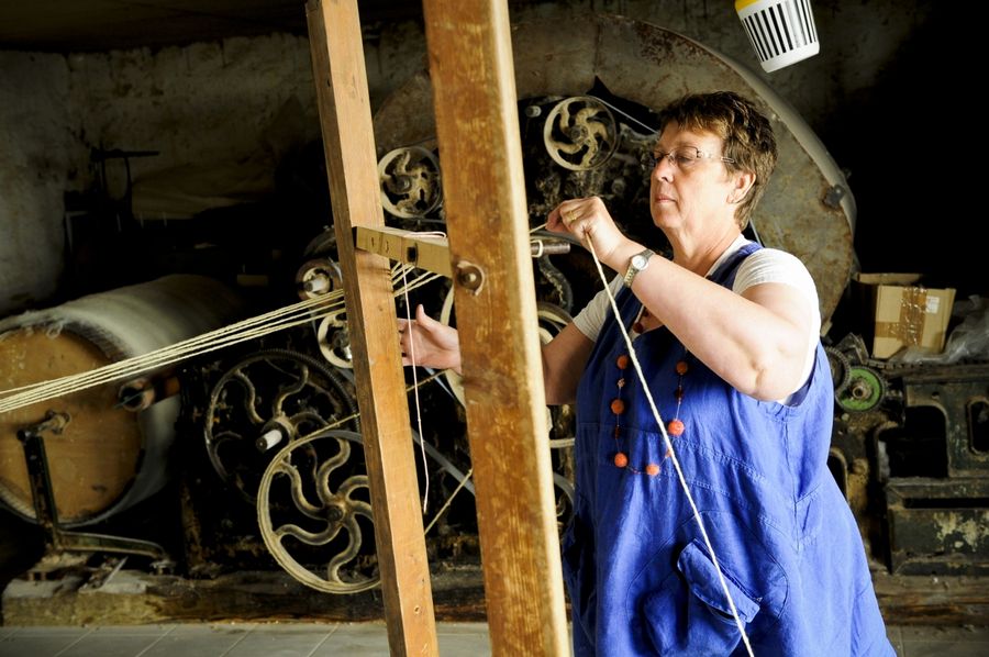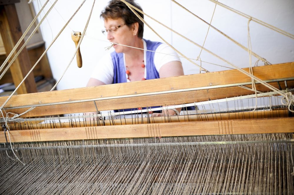 - De wol van onze eigen schapen, luxemburgse wol, alsook andere natuurvezels (vlas, katoen, zijde) worden bij ons op ambachtelijke basis in de weverij en de vilterij verwerkt.