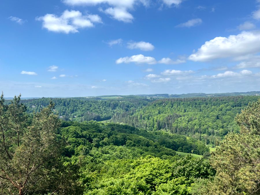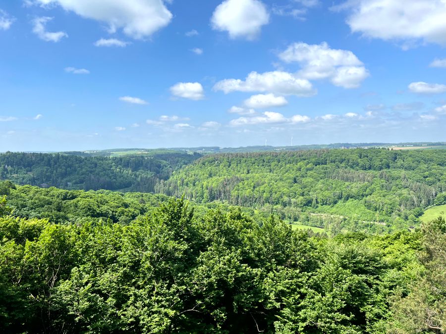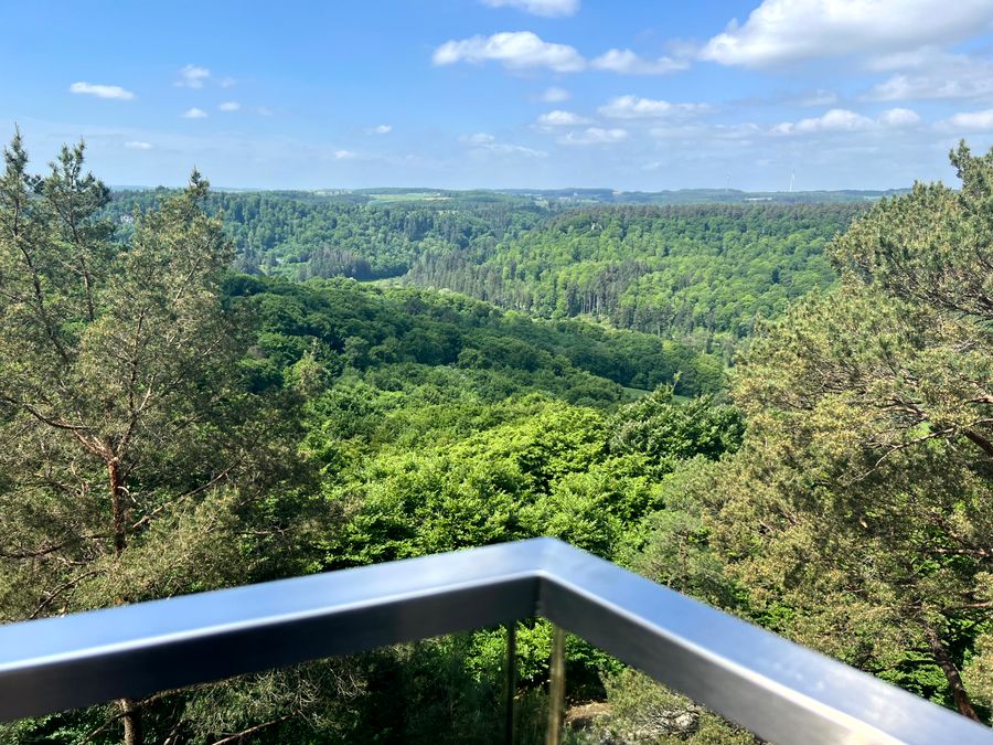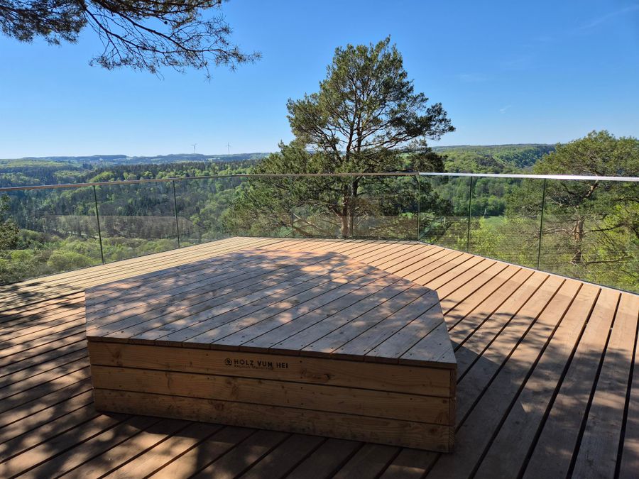 Het in 2025 gebouwde uitkijkplatform Ruetsbech biedt een wijd uitzicht over het dal van de Zwarte Ernz en het kenmerkende landschap van de Regio Mullerthal.