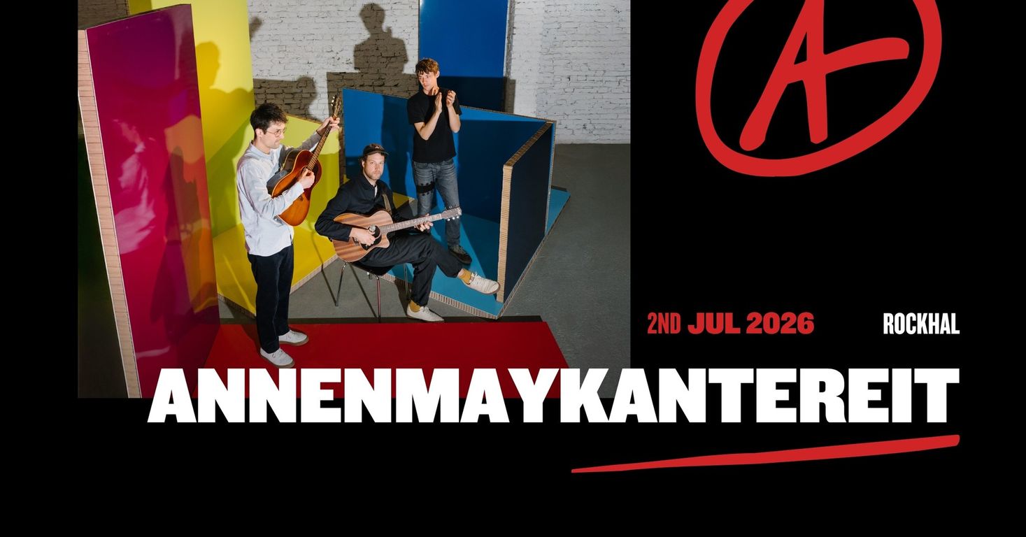 AnnenMayKantereit gehen 2026 endlich wieder auf große Tour! Seit ihrer Schulzeit folgen die Kölner dem Motto „Wird schon irgendwie gehen“ – und wie es ging: Von der Straße in die Stadien, Millionen Streams, Gold- und Platinauszeichnungen, Fans weltweit. Songs wie „Barfuß am Klavier“ oder „Oft gefragt“ prägen längst den Sound deutschsprachiger Popmusik. Nach einem ausverkauften Heimspiel im Kölner Stadion 2023 gibt es ab Juli 2026 neue Shows in Deutschland, Österreich, Luxemburg und der Schweiz – inklusive frischer Musik wie „Nur wir beide“.