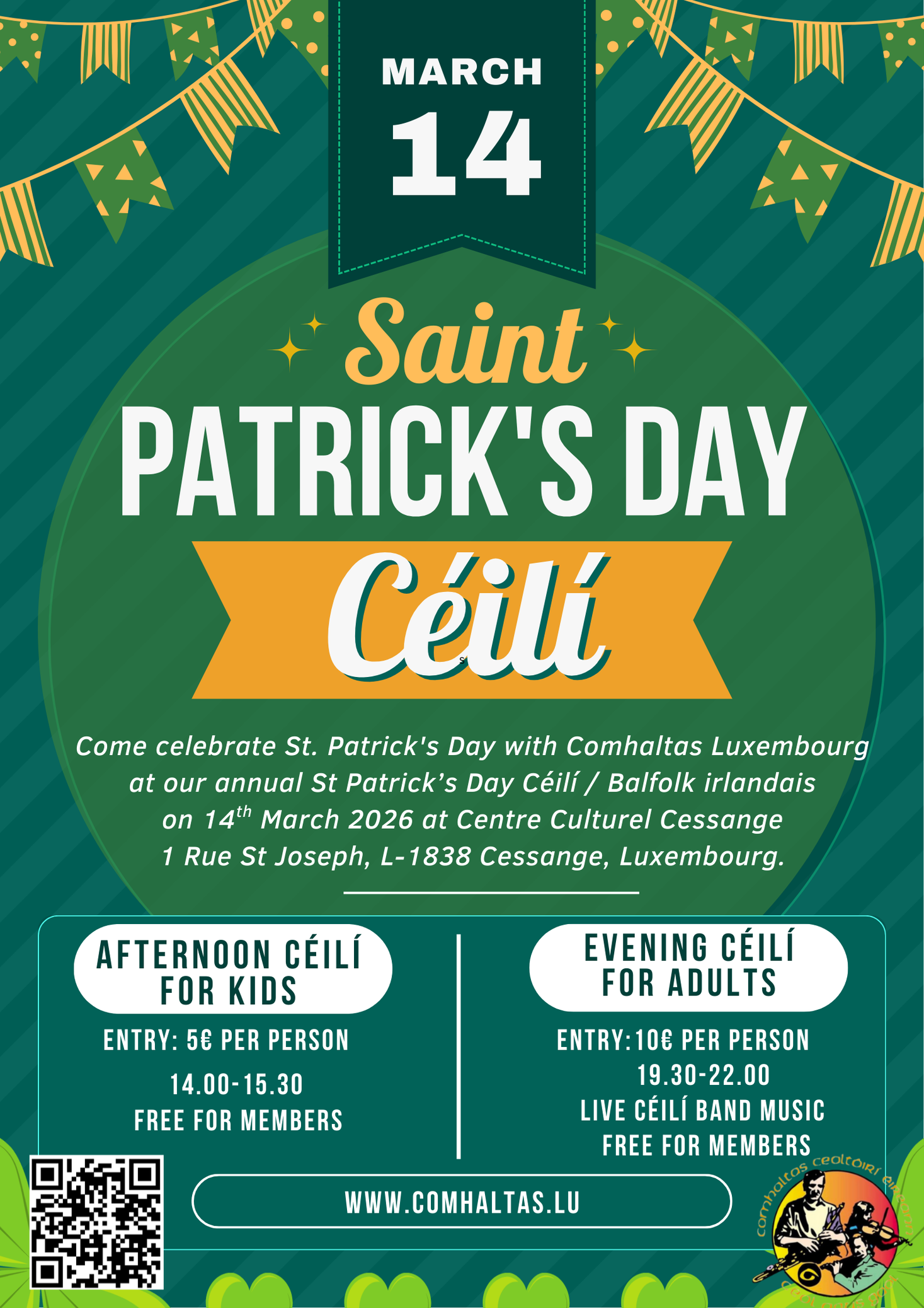 The Irish cultural association Comhaltas Luxembourg organises the annual St. Patrick’s Day event on Saturday, 14 March. The event takes place as a Céilí dance open to all in the Centre Culturel Cessange with a kids céilí in the afternoon and an adults’ céilí with live band in the evening – open for all levels, experienced and beginners. More information on www.comhaltas.lu
