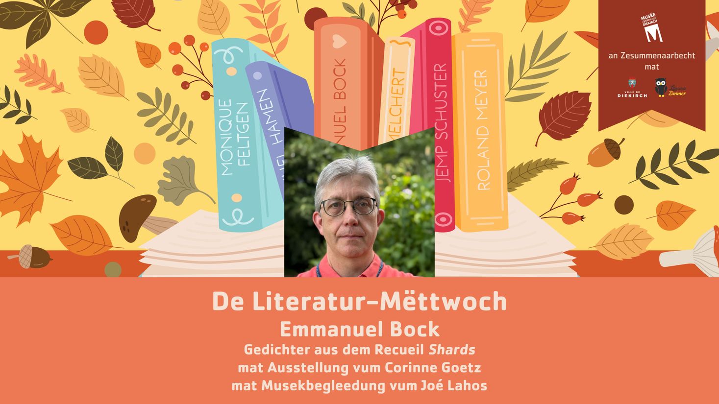 For the third reading in the “ De Literatur-Mëttwoch” series, in collaboration with the Ville de Diekirch and Librairie Zimmer, the Musée d’Histoire[s] Diekirch is pleased to welcome Luxembourgisch author Emmanuel Bock.