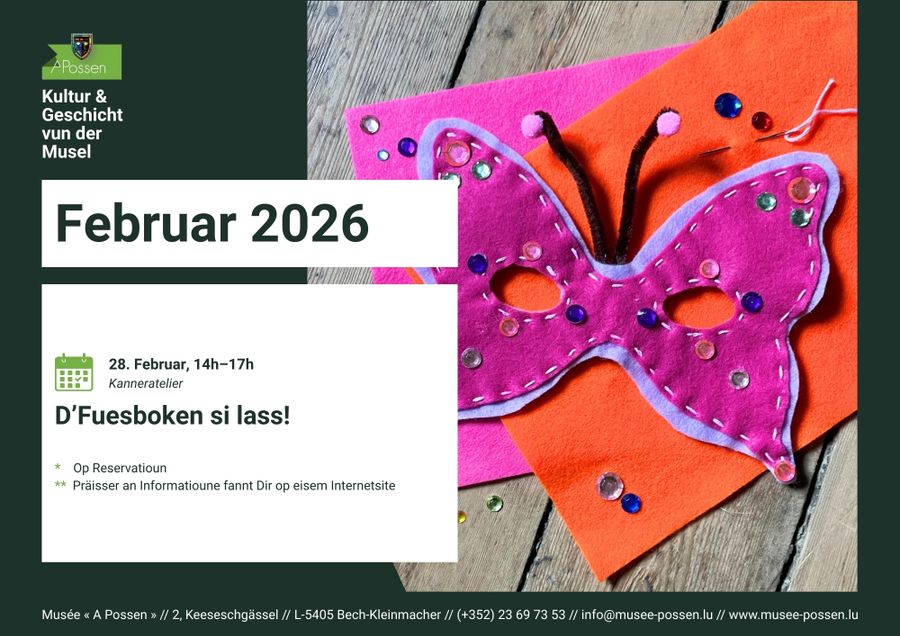 In Luxembourg, Carnival begins on Candlemas and is often celebrated until Mid-Lent Sunday. And what tradition is an essential part of Carnival, besides enjoying lots of treats? Dressing up! That’s why, on Saturday, February 28, our children’s workshop (ages 6 to 12) offers the chance to create a “Bokemask” (= a Carnival mask) from fabric. Together with our cultural mediator, the children will draw, cut, paint, and/or glue their creations so that by the end of the afternoon, each little designer can take home their mask and show it off at the next Carnival ball!