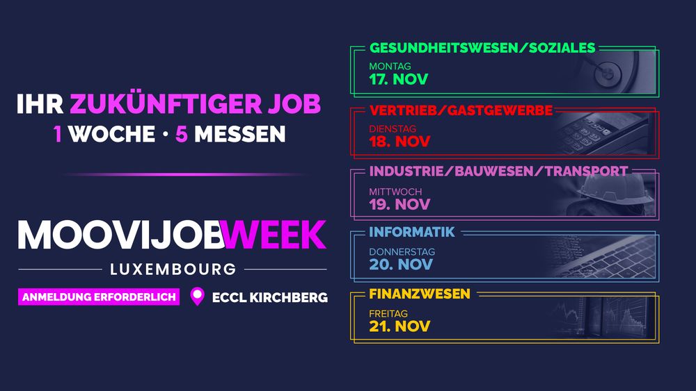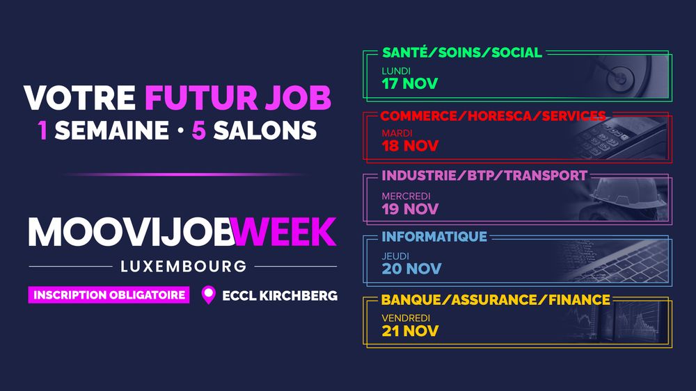 After an undeniable success in 2024 (with over 100 companies and nearly 15,000 visitors), the Moovijob Week Luxembourg returns for its second edition, from 17 to 21 November 2025! Over the course of a week, this new family of events offers 5 specialist themed days: