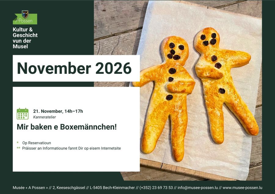 As our “Boxemännchen” workshop is very popular, children aged 6 to 12 will have another opportunity on November 21 to enjoy a creative and culinary afternoon at the “A Possen” Museum, making their own little dough figure! With the help of our mediator, they will prepare a creamy quark dough, roll it out, and cut their little figure according to the traditional shape. Then, each child can let their imagination run free and decorate their Boxemännchen with raisins and a small clay pipe. After baking, the pastries will be carefully packaged in a bag decorated by the children themselves, so they arrive home intact. A workshop where creativity, fun, and deliciousness come together!